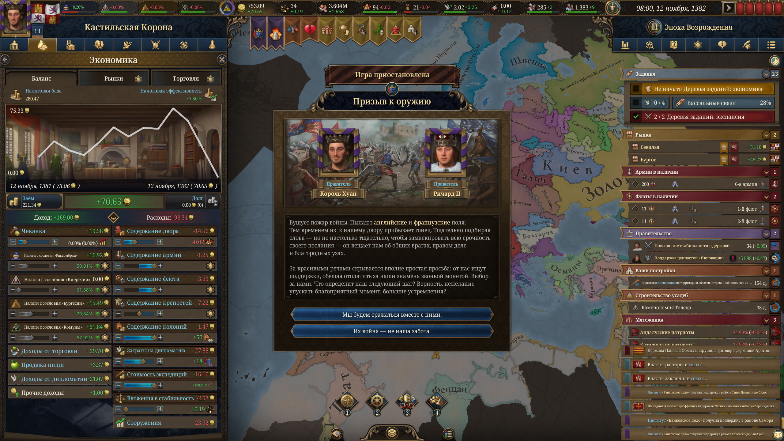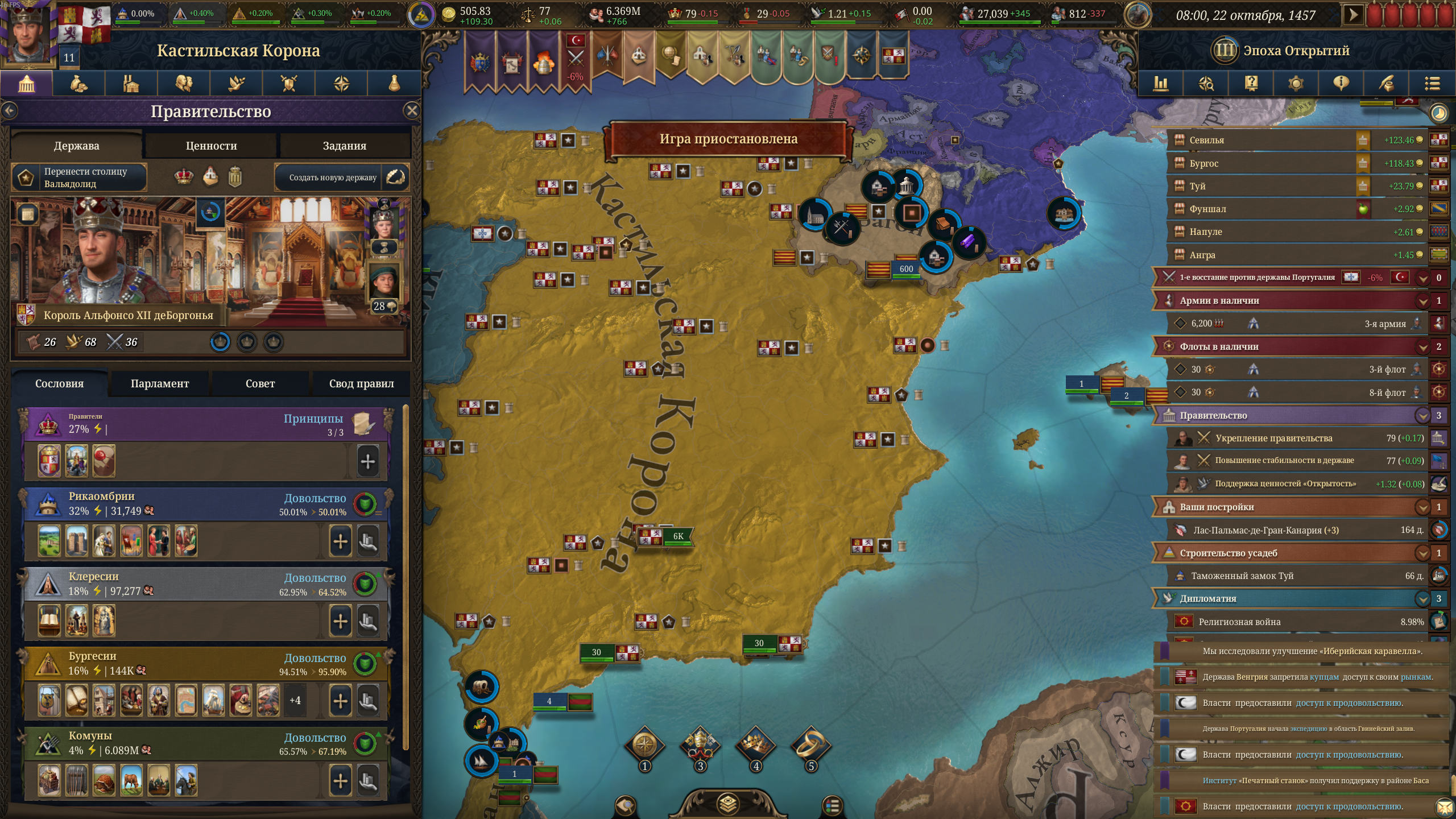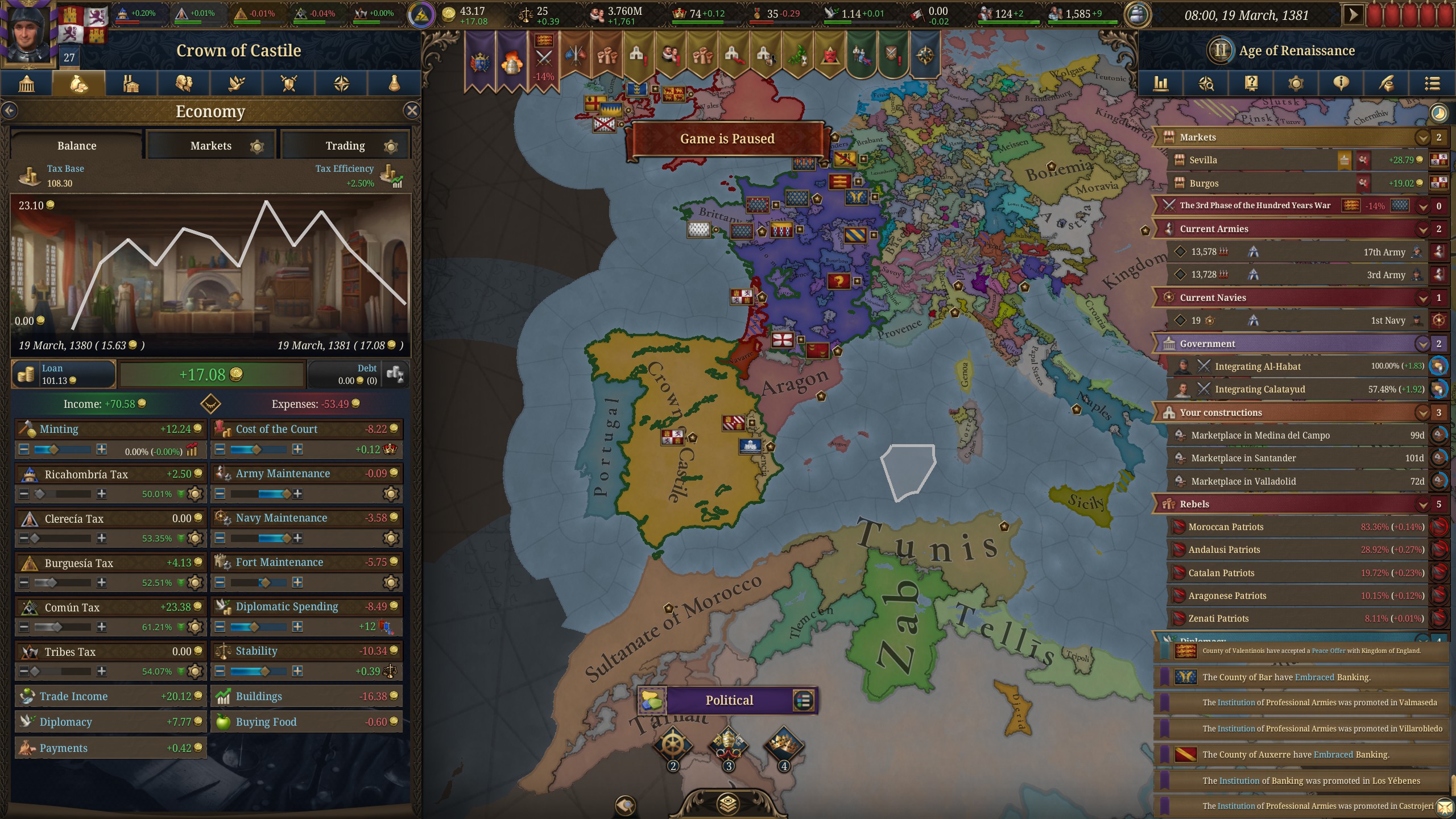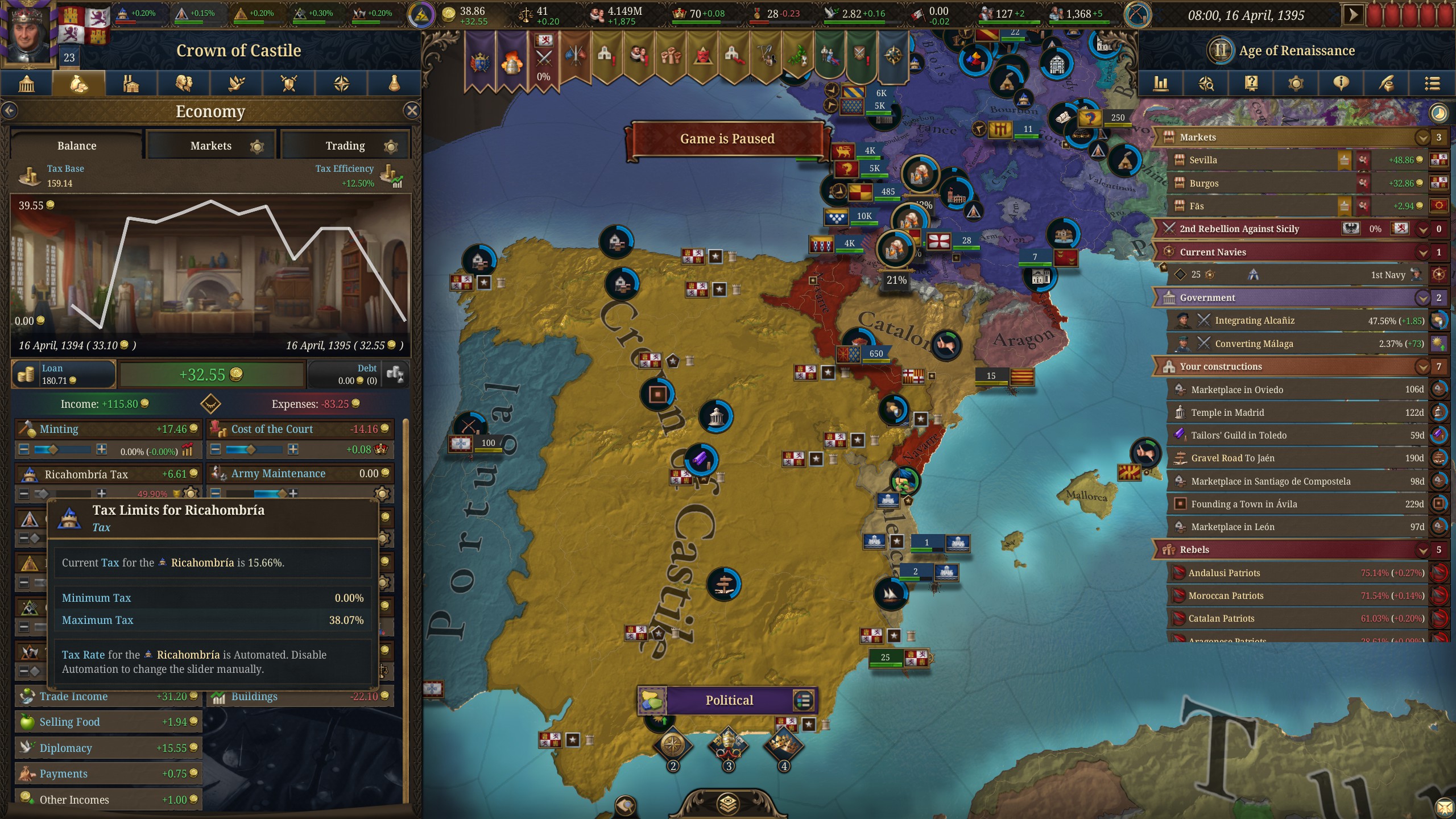 как за кастилию не сосать с деньгами? 1370 год, я в топе по населению, но доходов всего 50 дукатов тотал, при этом налоги выкручены на максимум для бургеров (но с них капает только 3 дуката) и пезантов. Ноблы негодуют, с них налогов по минималке, тоже где-то три дуката. Но я смотрю на леджер, я даже не в десятке по инкаму. Смотрю на соседей - они домиками радостно застраиваются, а у меня баланс околонулевой, любой негативный эвент отправляет займ брать.