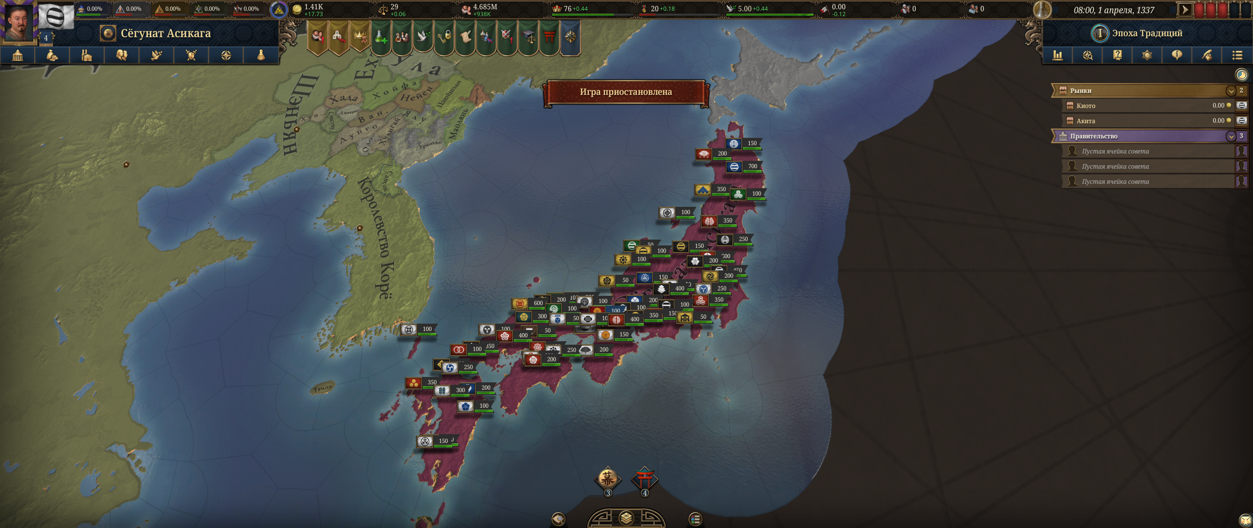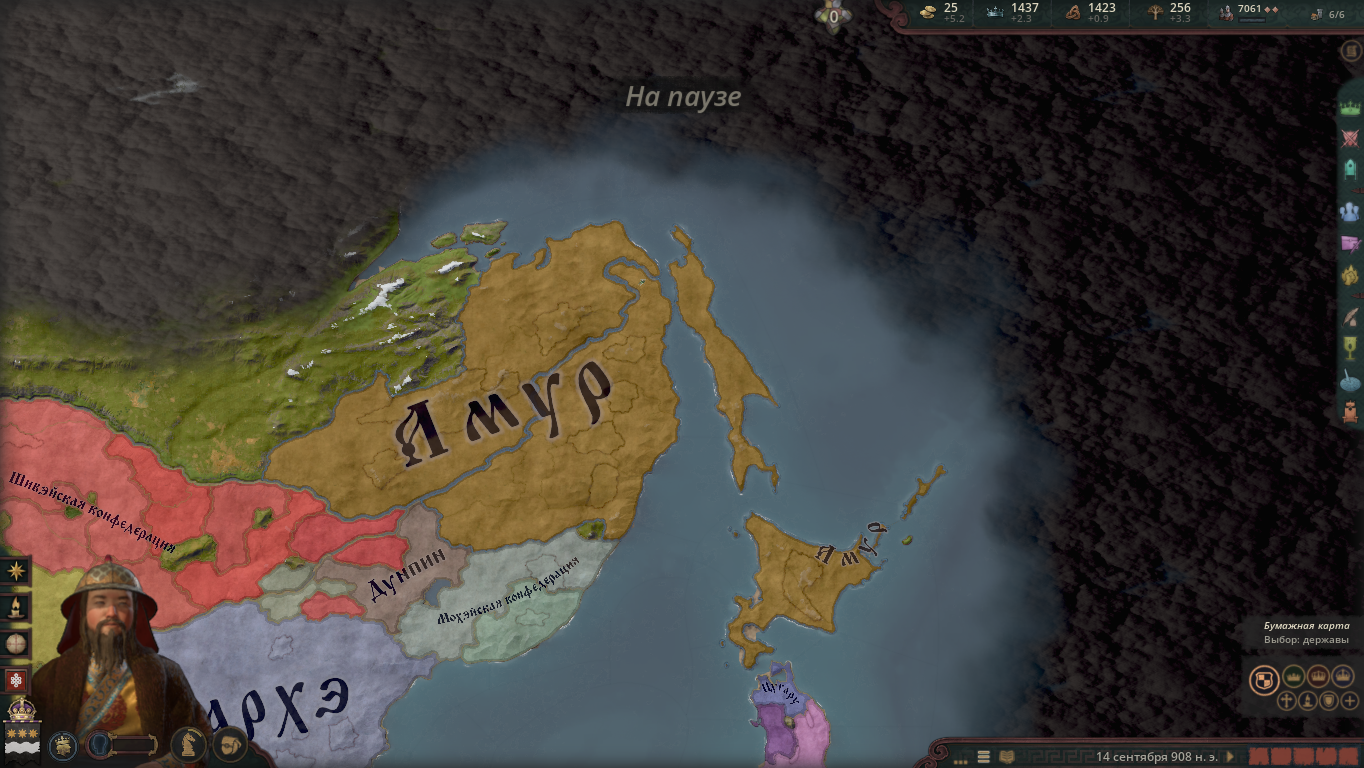 Добрались чтобы понять что в японии не сегунат, а припизднутая форма административного правителства. Я попытался получить землю через женитьбу. Но там наследники земель меняются так быстро и рандомно что пиздец. Даже разбираться не стал. Принял синтоизм и пошел к айнам и отжал у них землю. Снарядился, захватил три герцогства. И создал королевство хоккайдо, состоящее из собственно из острова хоккайдо, острова сахалин и небольшого куска самой японии, который хз почему каким-то челам принадлежал рандомным. Дальше несколько поколений гриндил ресурсы и дипломатию. Отжать что-то у японии довольно сложно. Они плавают туда-сюда. У них самураи ебашат сильно и армия по численности и качеству превосходит то, что пишет подсказка при наведении мышкой. При 5 тысяч в окне начала боя, они умудряются 10 высирать где-то. Еще и замки ебейшие на каждом милиметре, которые осаждаются с моими африканскими осадными орудиями по несколько лет. В какой-то момент я смог еще и амур отжать, сделать королевство, которое потом отлетело с чудесным конфидеративным разделением, в целом похуй было, они союзники, но чуть позже это небольшую свинью подложило.