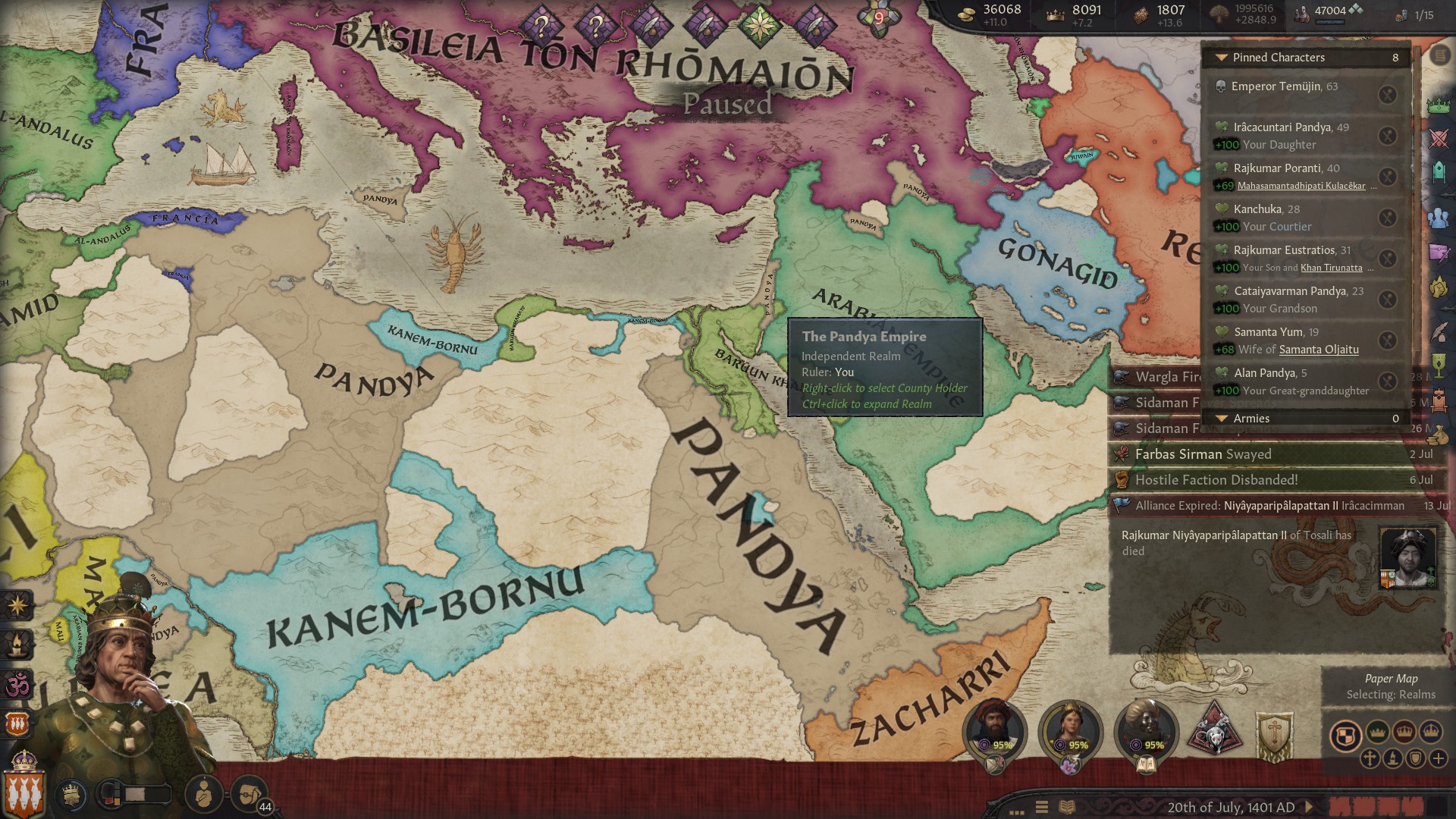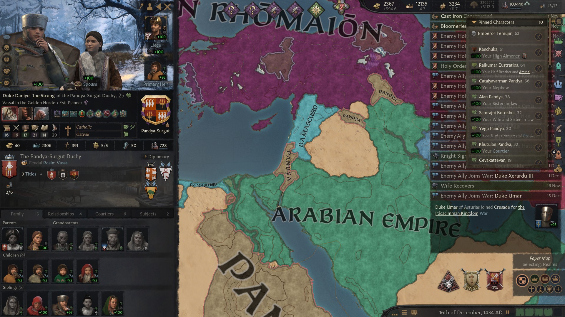 Начал играть с самой ранней эпохи за черного путешественника из культуры акан. Выбор почти рандомный, довольно далеко что главное, но еще у них есть культура что женщины тоже рыцарями могут быть, что имба, ты и головную боль с поддержанием количества этих рыцарей убираешь, так еще очень часто они и по статам сильнее. Бонусом идут рейдерство и лучники более крутые. Дальше было путешествие в японию длительностью в 20 лет. За это время смог найти много хороших компаньонов, друзей. Даже византийскую любовницу, с которой смог заделать несколько детей-бастардов. Было довольно весело, особенно через пустыню пробираться, где припасы улетают в ноль через каждые три клеточки. Но в итоге добрались.