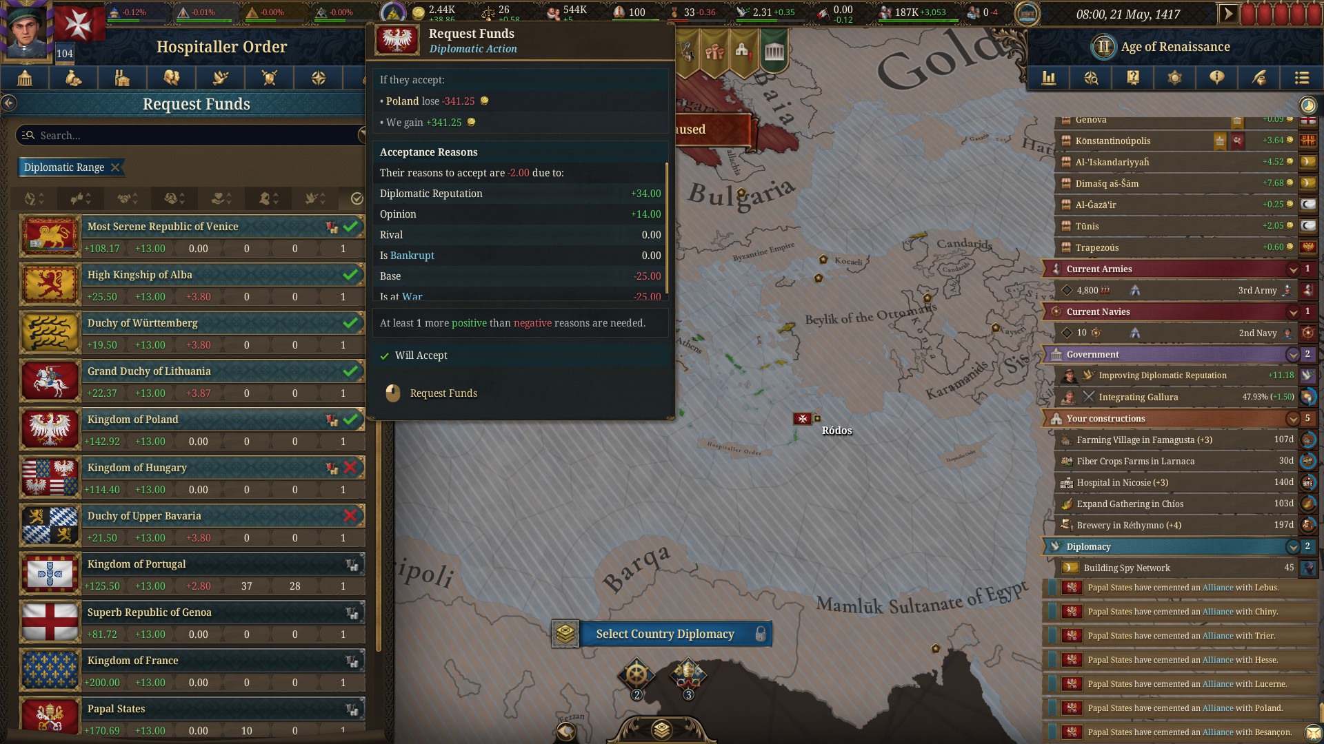 построил домики в столице, так как контроля нигде нет. Контроль как я понял здесь как автономия в прошлой части, только какие то анальные ограничения на него. Так что застраивал только Милан сам. Еще в планах развести на favors Францию, она даст целых 400 монет, это как мой доход за 60+ месяцев, вообще кайфону, построю домики на все деньги.