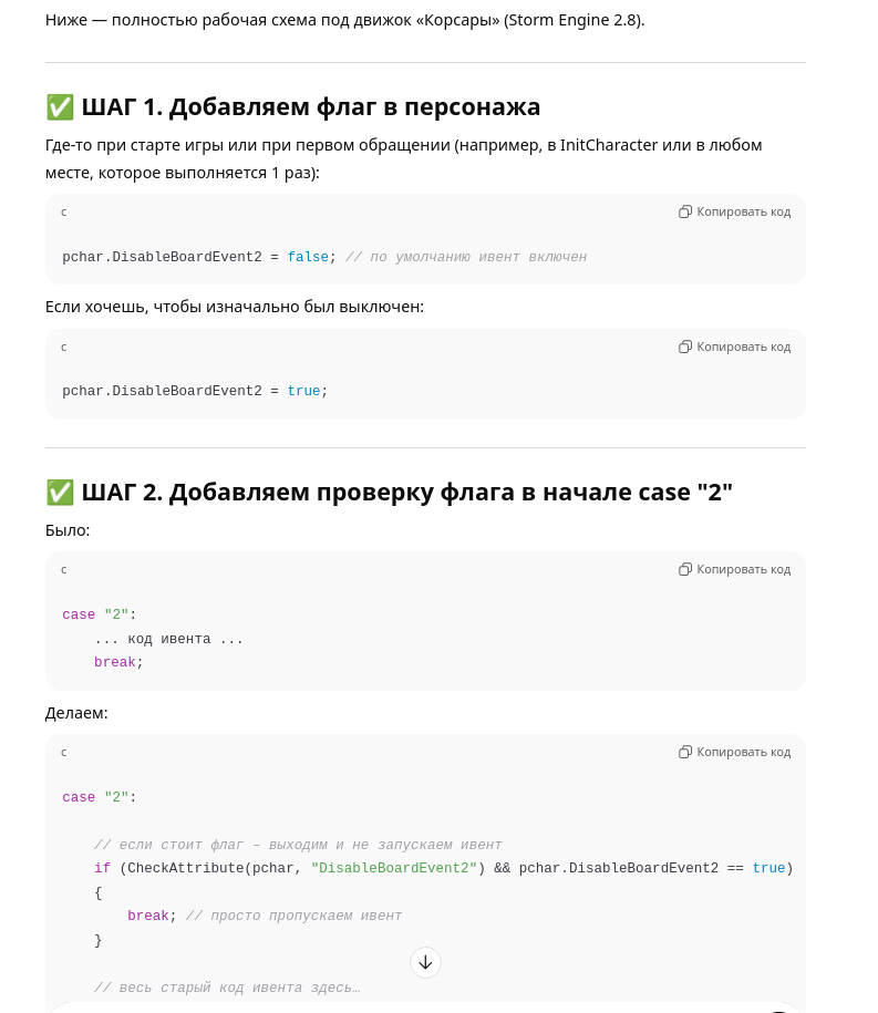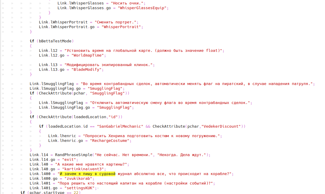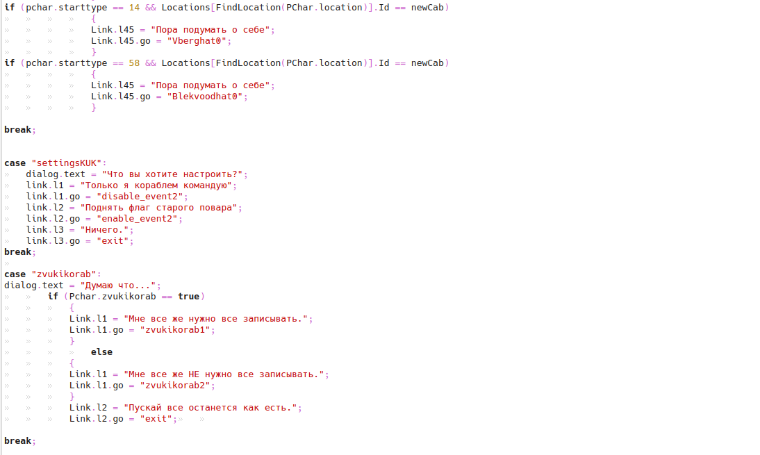 >>50499352 Переписал case "settingsKUK": dialog.text = "Думаю что..."; if (pchar.DisableBoardEvent2 == true) { Link.l1 = "Поднять флаг старого повара."; Link.l1.go = "enable_event2"; } else { Link.l1 = "Только я кораблем командую."; Link.l1.go = "disable_event2"; } Link.l2 = "Пускай все останется как есть."; Link.l2.go = "exit";