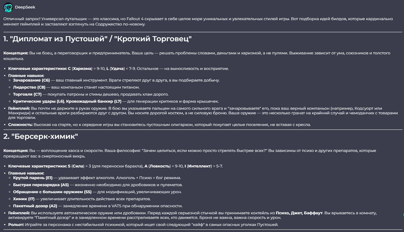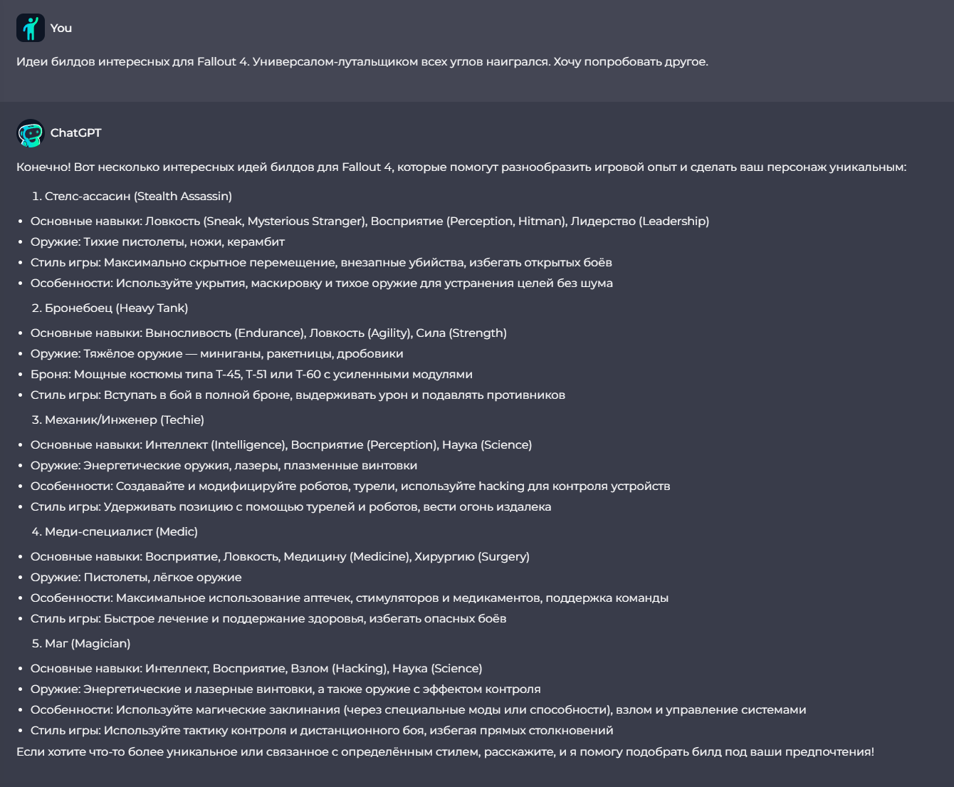 Аноны, накидайте идеи билдов интересных для четвёрки. Универсалом-лутальщиком всех углов наигрался. Хочу попробовать за милишника и задохлика-стелсера-харизмата-интеллектуала какого-нибудь