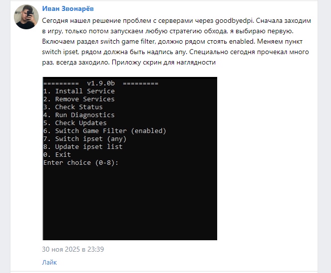 Во-первых, встала проблема просто запустить помойку - нет подключения к игровым серверам. В игру заходит, меню есть, а дальше всё, при попытке подключения к серверу рвётся связь. Понятно, что тут дело не в игре, но почему-то мало решений в инете, при том, что многие жалуются и в стиме, и в разных сообществах в ВК. К счастью, нашёлся рабочий способ, челик в ВК скинул (первый скрин), спасибо ему, только прога не гудбайдпи, а Flowseal/zapret-discord-youtube версии 1.9.0b с гитхаба. У меня, к слову, с ней ютуб без впн заработал, приятно.