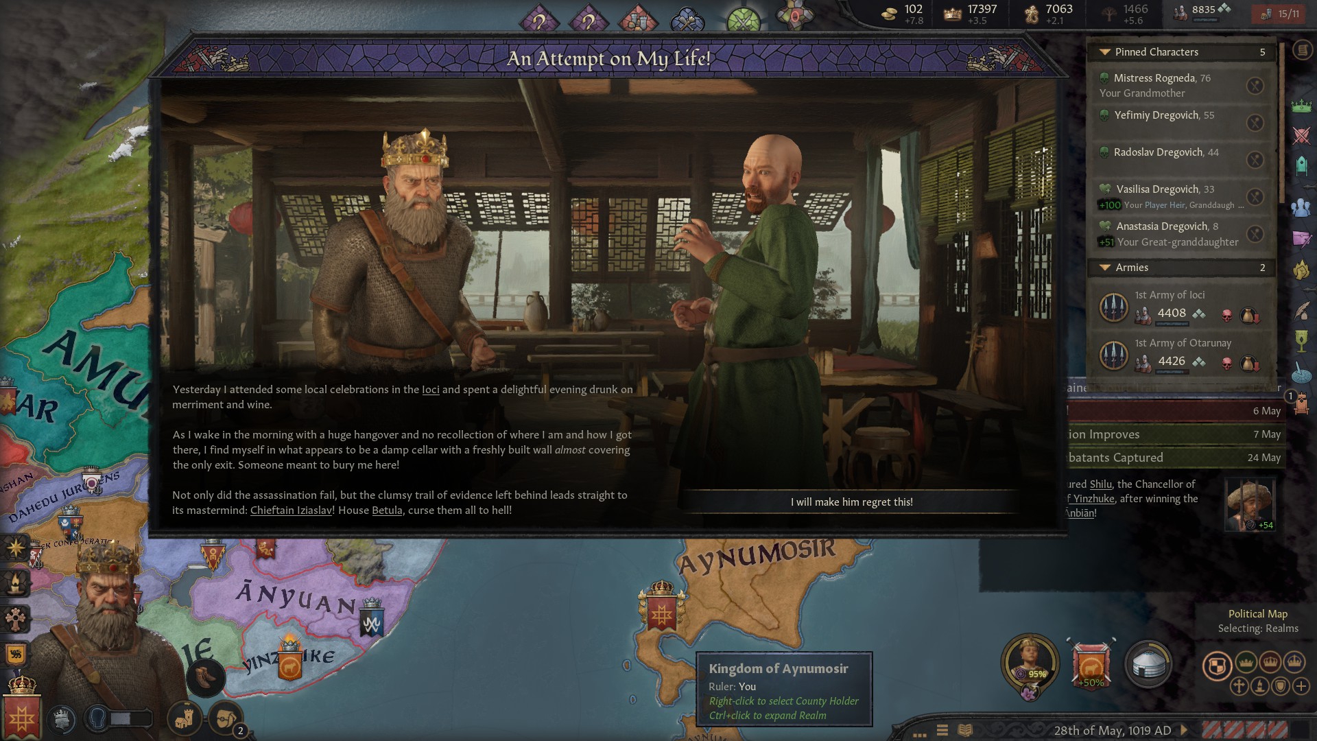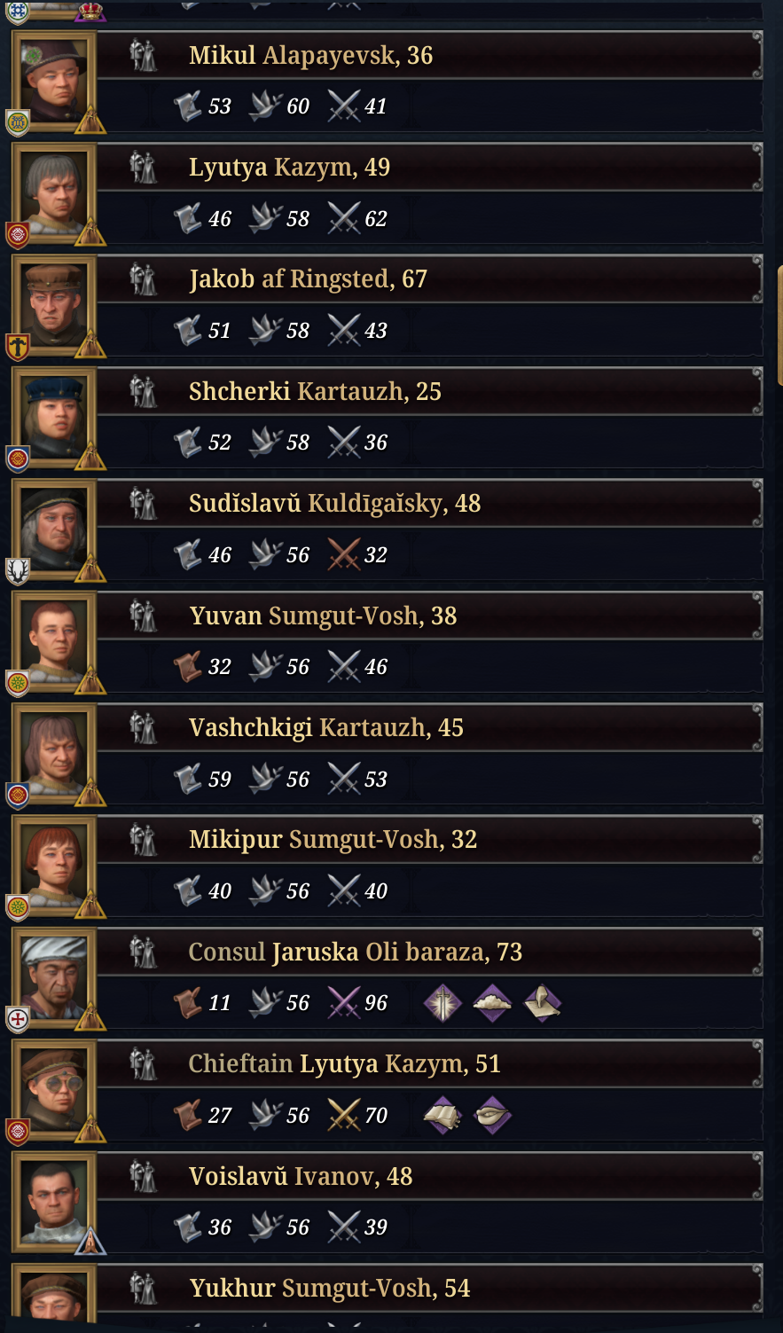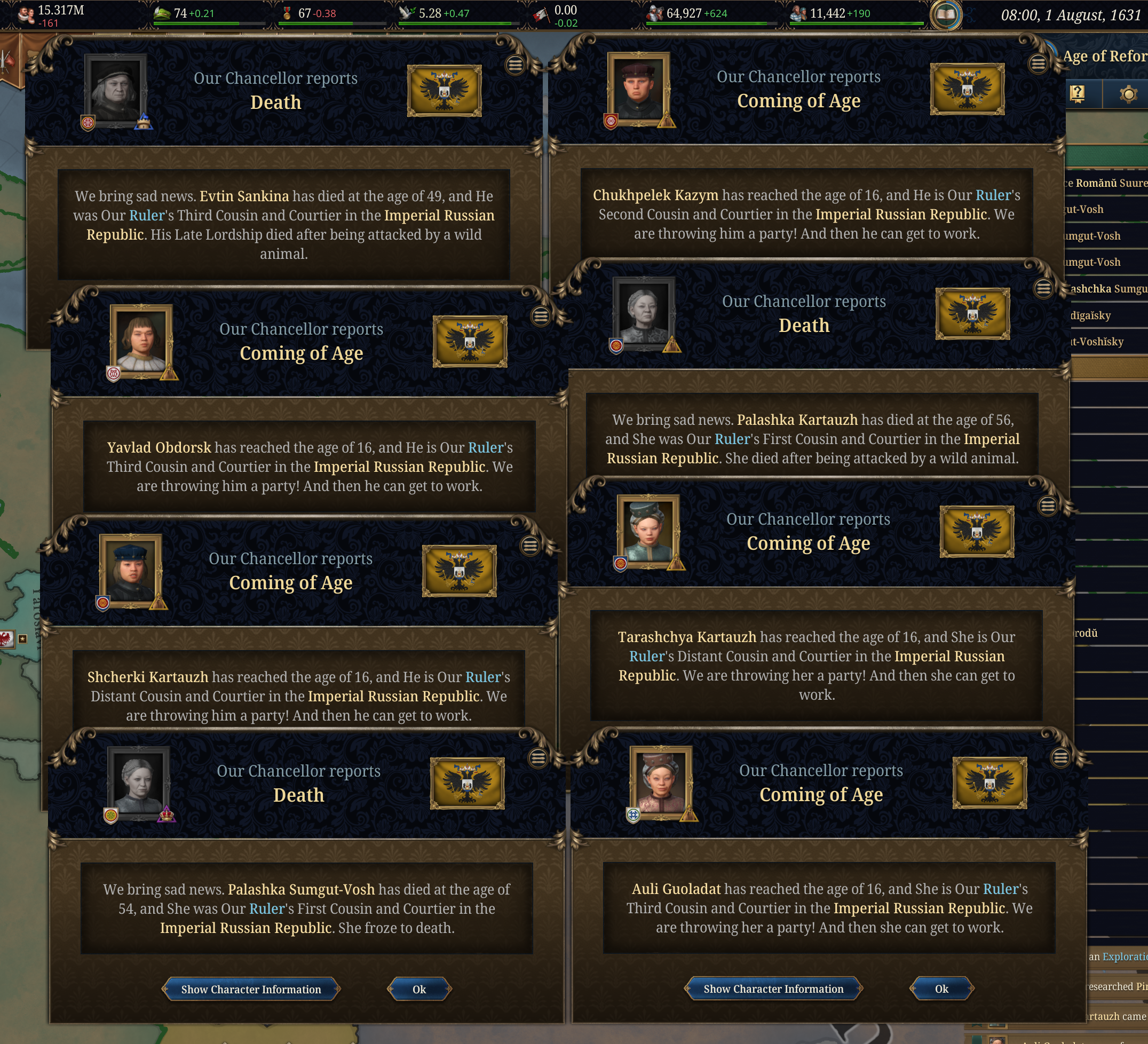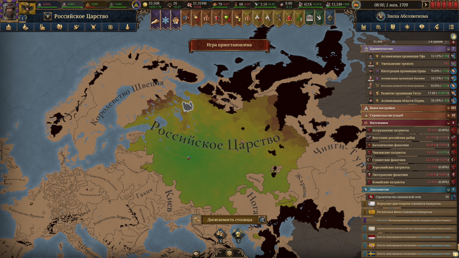 >>50450499 Я хотел посмотреть что будет если дворяне восстанут, будут ли какие-то интересные ивенты или вообще какие механики восстания есть, что вообще будет при восстании дворян и как это дело пойдёт дальше... ну типа уменьшится ли сословие дворян по итогу, смогу ли я отобрать у них все права в свою пользу или в пользу сословия горожан скажем, то есть мне был интересен процесс этого всего... в итоге я получил 8 лет тягомотины и восстание завершилось..... 1 окошком, где мне написали, что я победил и пришло время наказывать виновных, но никого наказать и казнить не дали
