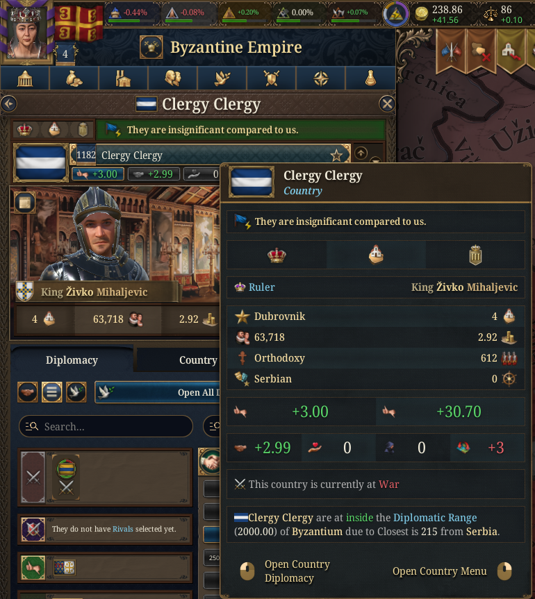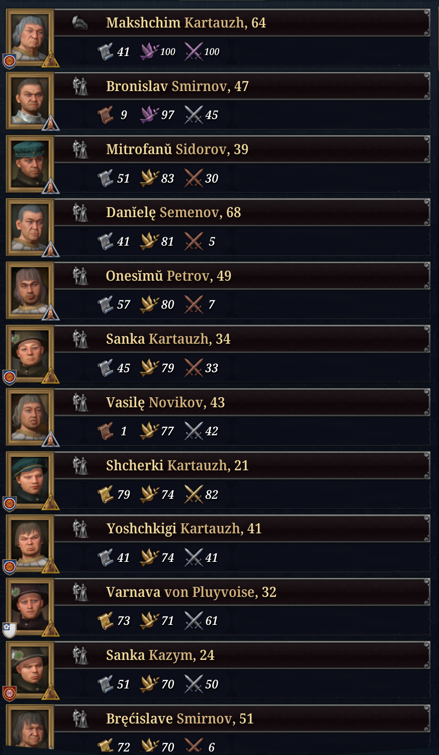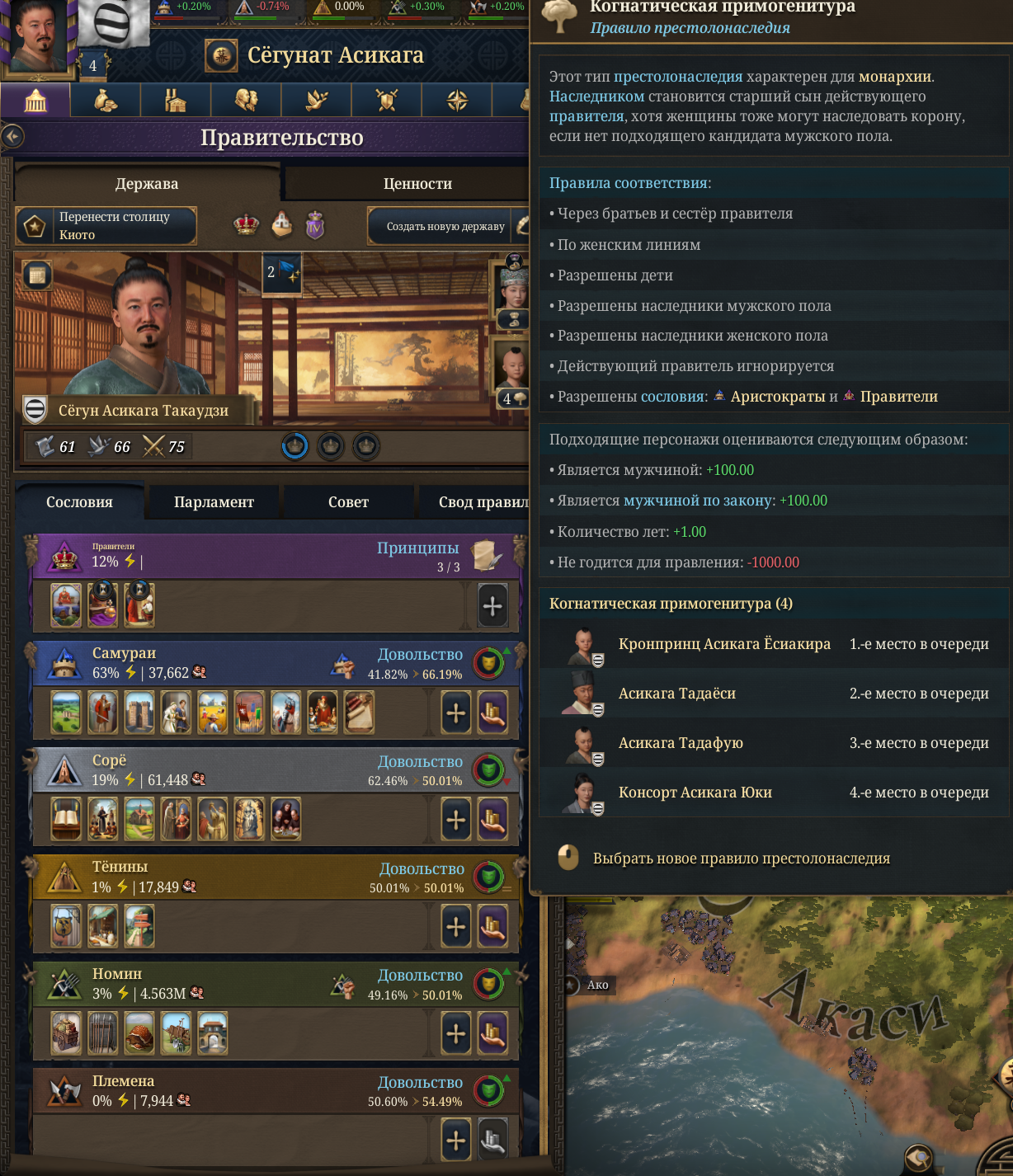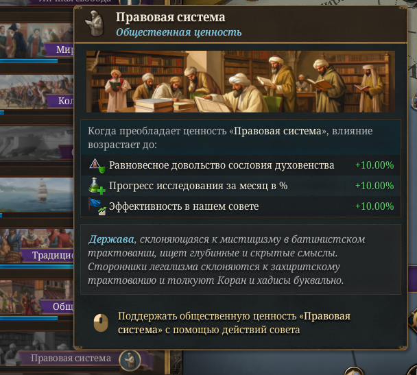 >>50450428 Сословия не обижаются от того что ты им даешь привилегии, но обижаются когда даешь привилегии другим сословиям, в подсказке даже пишется сколько лояльности будет утеряно. Зная это у тебя вообще не должно быть восстаний. Другой важный момент это ценности в стране, а именно те которые дают равновесную лояльность, например традиции, общинность и децентрализация. Еще важна легитимность, ее надо держать на сотке, и стабильность, ее надо держать в районе 50 потому что чем ее больше тем ниже прирост и ~50 это оптимально. Третий важный момент это парламент, во время его все сословия получают дополнительный прирост лояльности, если она ниже равновесной. Четвертый важный момент это сила короны, которую можно повышать благодаря принципам и представительству коронных людей (чаще всего родственников правителя в случае монархии) в совете, в генералах и адмиралах. В идеале все советники, генералы и адмиралы должны быть членами правительственного сословия, а один из правительственных советников главой совета (пкм по советнику и "сделать главой совета")