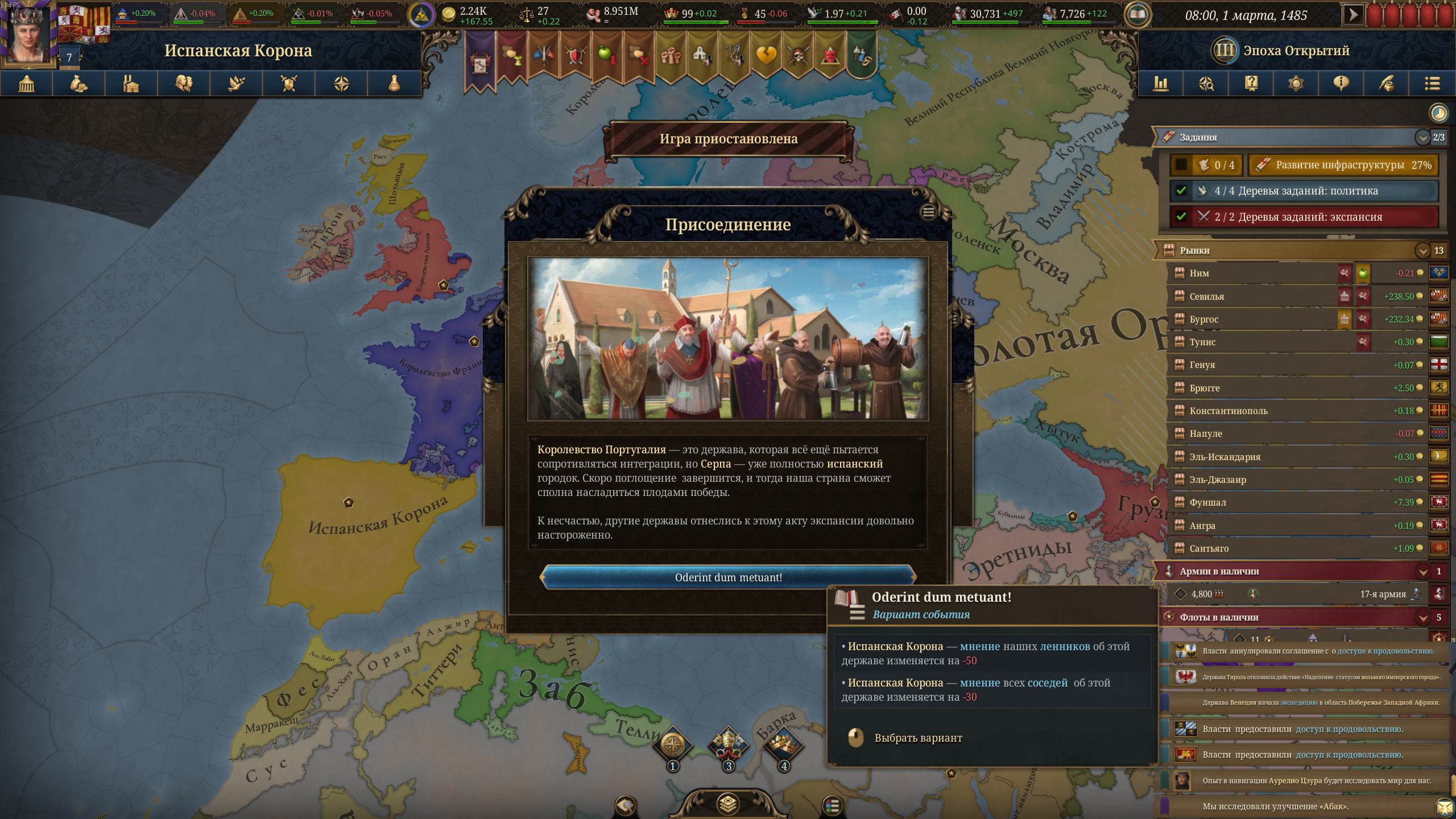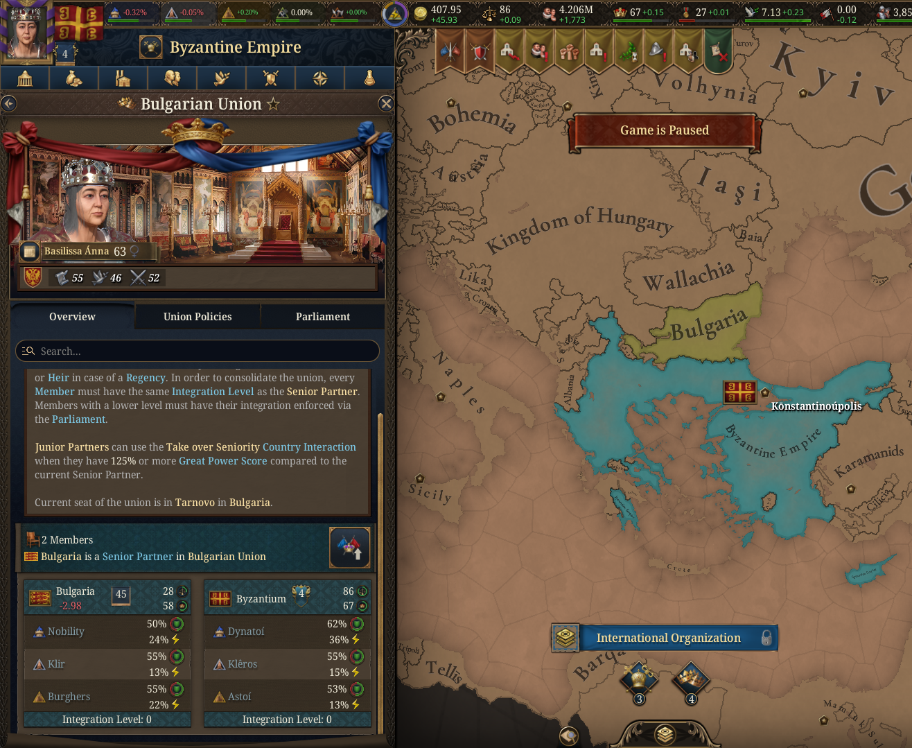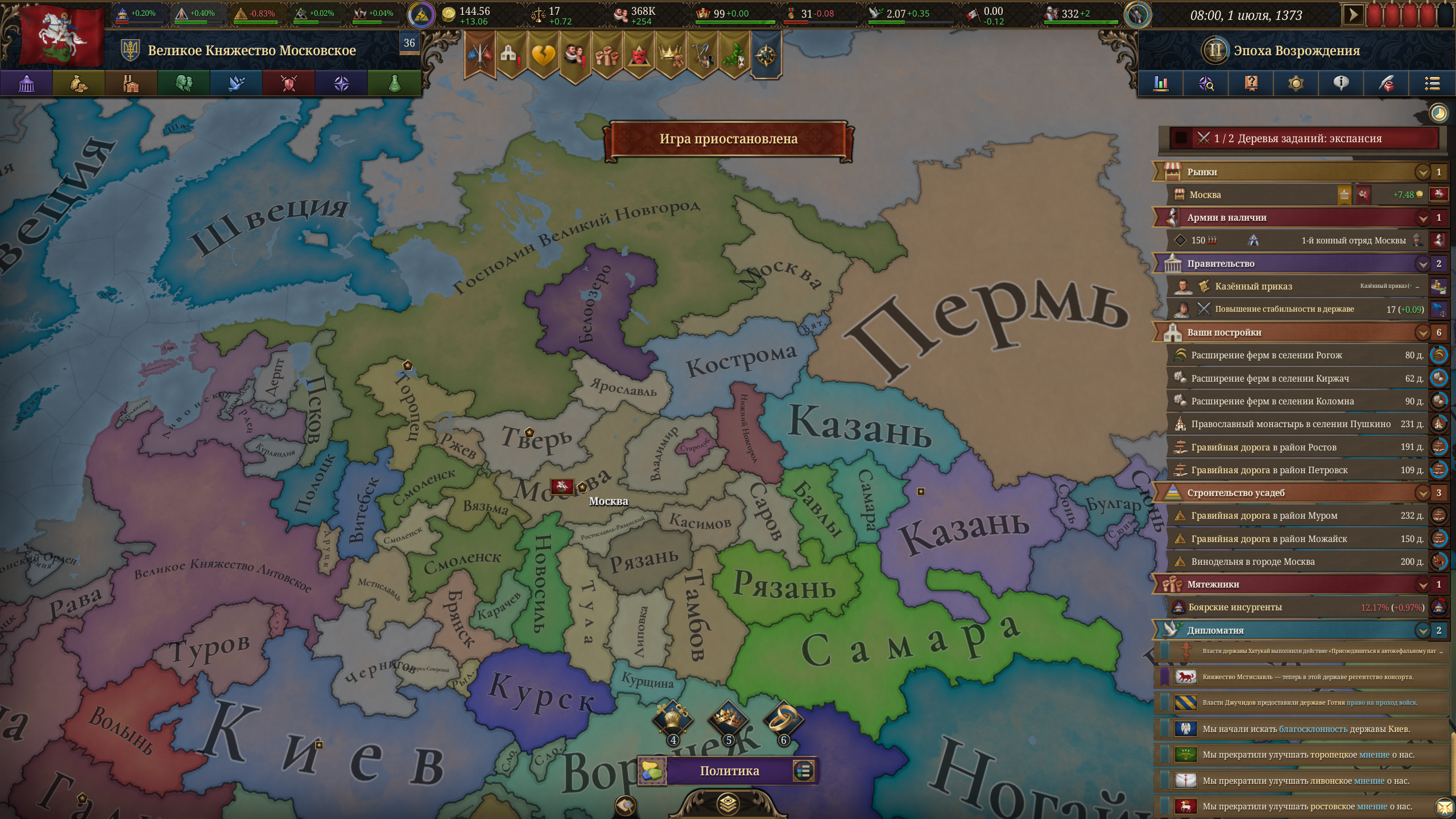 Унии - игрушка дьявола, ежжи. Если играете за Москву, то старайтесь их делать своими вассалами. Ведь чтобы присоединить членов унии нужно проголосовать за законы, позволяющие это делать. А не факт, что все за них проголосуют, ведь если кроме тебя ещё 3-4 ии болванчика голосуют против закона, то ты его никогда не примешь. И чтобы принять законы на интеграцию нужно ждать 50 лет. К тому же члены унии могут сами устраивать войны, например Тверь влетела в Новогород, который был в союзе со Смоленском. А войск-то сука нет, ибо ордынцы требуют кроме бабла ещё силу мужика, так что приходилось воевать голым ополчением. Но благо Тверь смог сдеоать вассалом, а Владимир сам сделал вассалами или сожрал других членов унии и оставшись с ним вдвоём я смог протащить нужные законы. В общем покрас не радует глаз из-за этой ебли с унией, зря я начал с ней играться. Долго ещё шли институты, недавно совсем профессиональную армию открыл, щас изучу войска и пойду карать орду, блашо их тиур покусал.