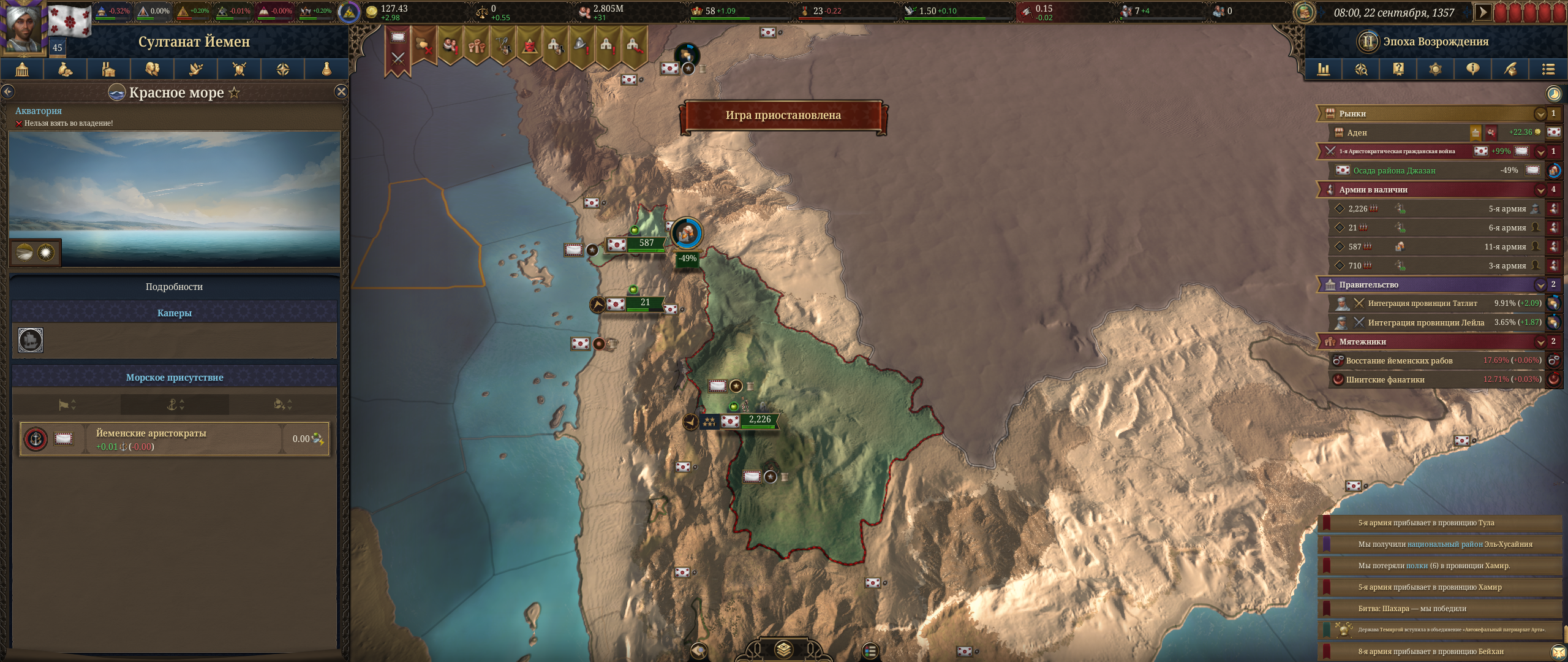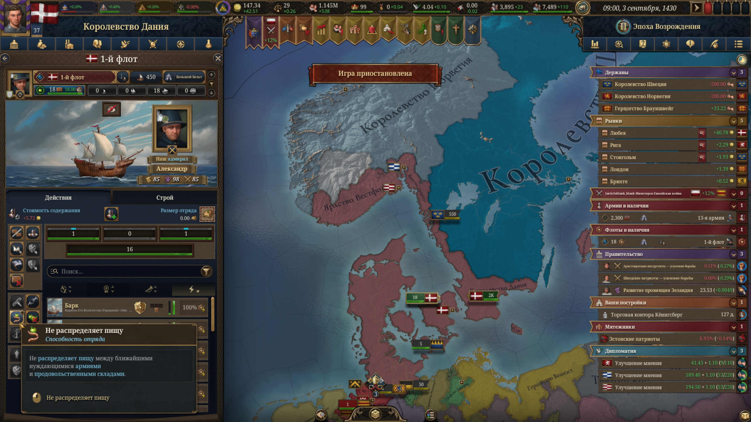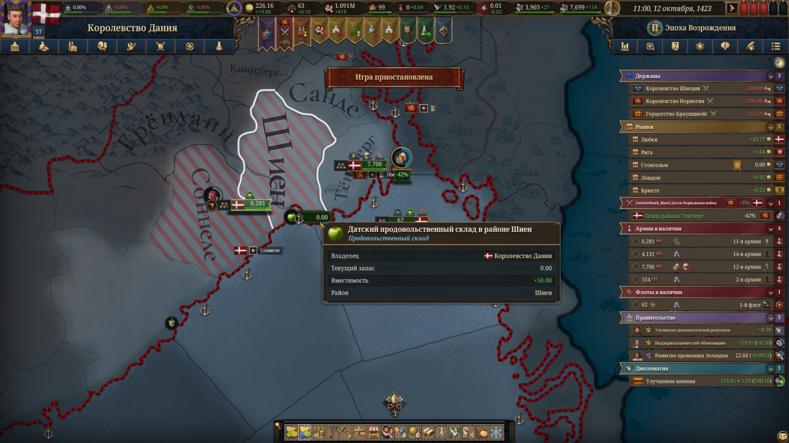 >>50432348 (OP) > Europa Universalis V Поиграл, спасибо, что с торрентов. Начал обучение за Норвегию на сложности, собственно, обучение. За эту страну полагается просто сидеть-пердеть и постигать премудрости. - денех нет. Вообще нахуй нет никаких и никак. Нет очевидных способов эти деньги зарабатывать. - бичи бунтуют и хуй вообще пойми, что им конкретно не нравится. Ну или я не увидел плашки с модификаторами, которые отношения с сословиями режут. - каждое первое число дикий пролаг на пару секунд. Мне так предлагают до 1836 сидеть? В хуй пусть свистнут, лол. А дальше будет только хуже. - армия поднятая дохнет от голода мгновенно - UI говно из жопы дьявола, стоило подрядить типов, которые UI для виктории третьей делали. - Забаговано пиздец. У меня мятеж аристократов развалил мою нищеармию и потом сам издох хуй пойми от чего и мне написали, что я подебил.