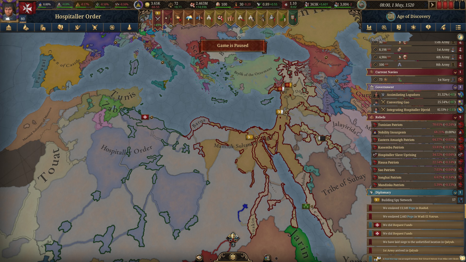 >невозможно собрать огромную армию и пойти дать пизды мамлюкам или устроить высадку в Индии Я на Гранаде могут за ~5 годовых бюджетов собрать наемничью армию и на крепостях разбить Кастилию у которой население в 10 раз больше.