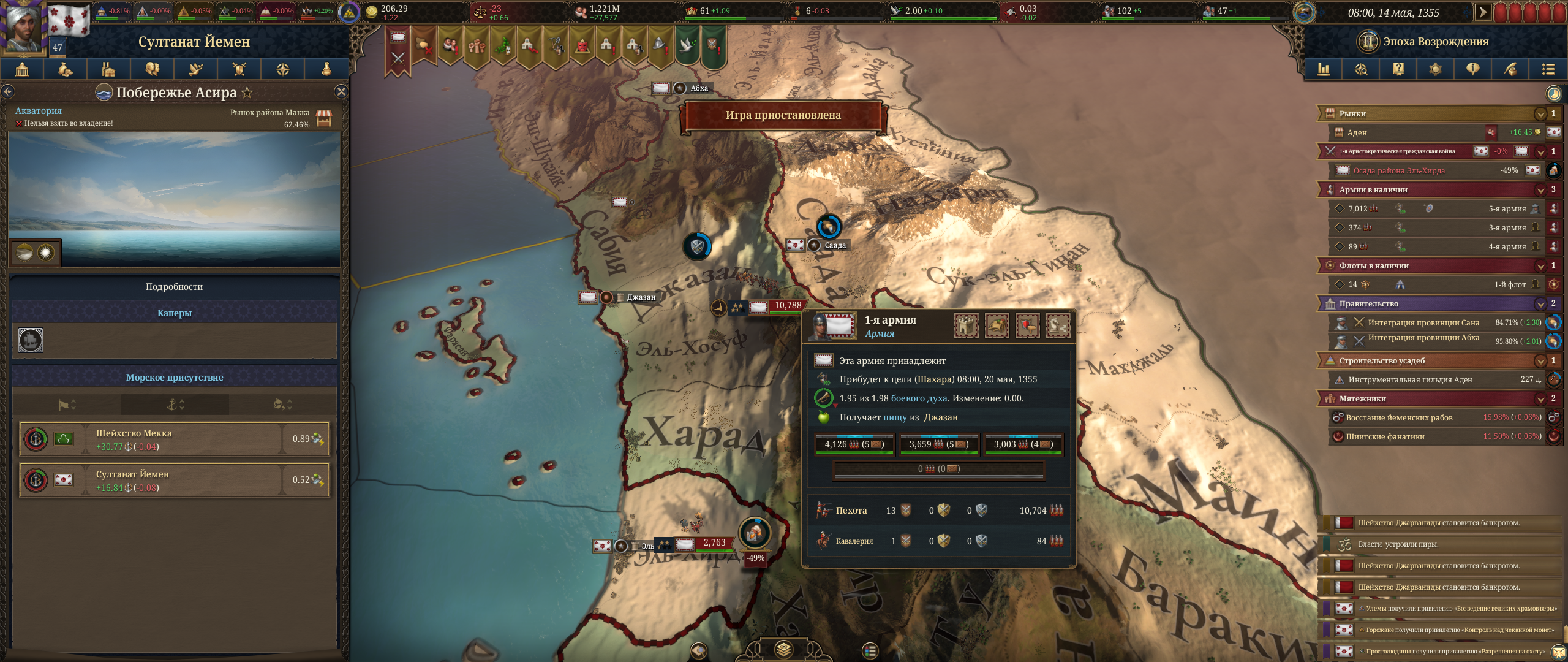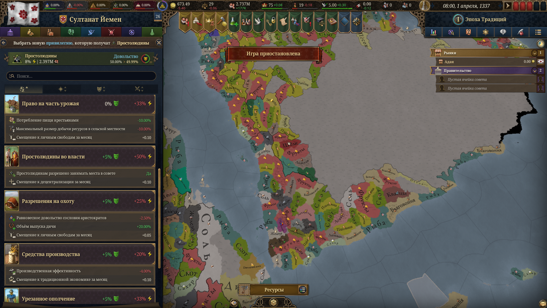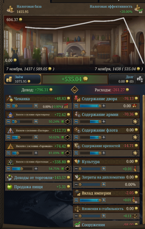 >>50450437 Заметно как ты знаешь что делаешь. Я даже не полинился в игру зайти и перепроверить что ты там понажимал. >султан разрешил им охотиться в угодьях дворян В стране где нет ни 1ой провки с дичью. >горожане обиделись, что их допустили до контроля чеканки Очень мудрое решение словить сразу -10 макс налога и минус чуть чуть инфляции в стрене без единого рудника. Да и с ними это очень спорная привилегия. Ну и как ты умудрился заставить эмиров восстать я совсем в ахуе, у них тут со старта 67 нахуй довольства. Ты явно олд серии который имеет четкий план на игру, а не ослина жмущая всё подряд.