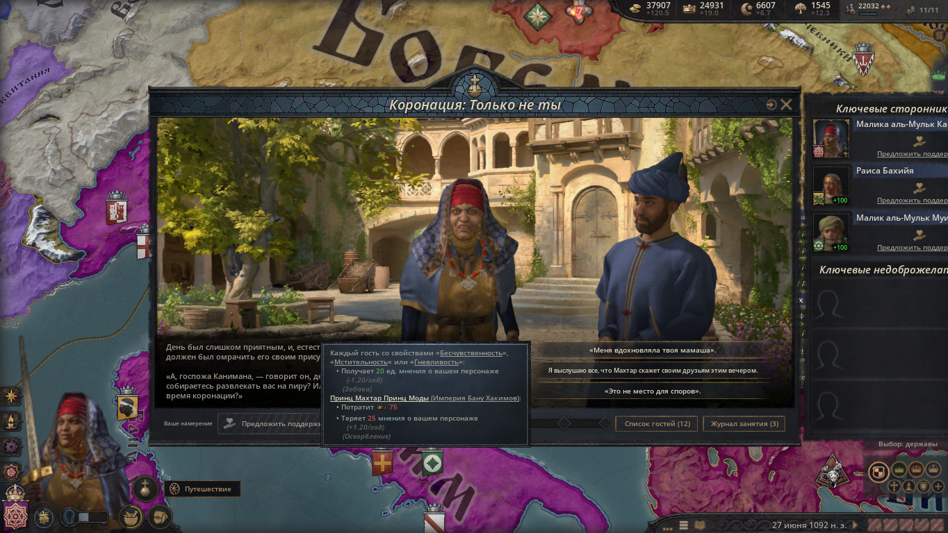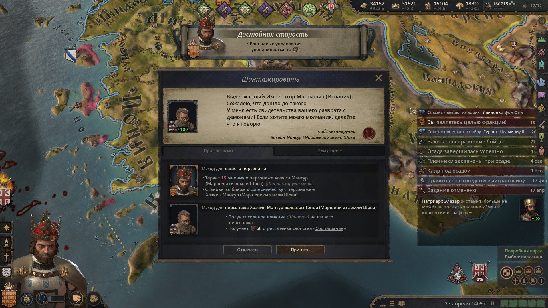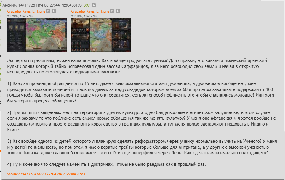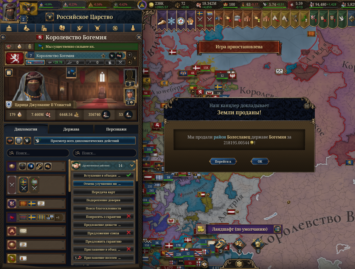 >>50450437 Заметно как ты знаешь что делаешь. Я даже не полинился в игру зайти и перепроверить что ты там понажимал. >султан разрешил им охотиться в угодьях дворян В стране где нет ни 1ой провки с дичью. >горожане обиделись, что их допустили до контроля чеканки Очень мудрое решение словить сразу -10 макс налога и минус чуть чуть инфляции в стрене без единого рудника. Да и с ними это очень спорная привилегия. Ну и как ты умудрился заставить эмиров восстать я совсем в ахуе, у них тут со старта 67 нахуй довольства. Ты явно олд серии который имеет четкий план на игру, а не ослина жмущая всё подряд.