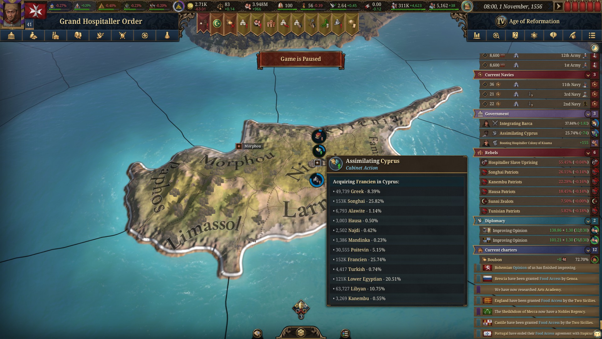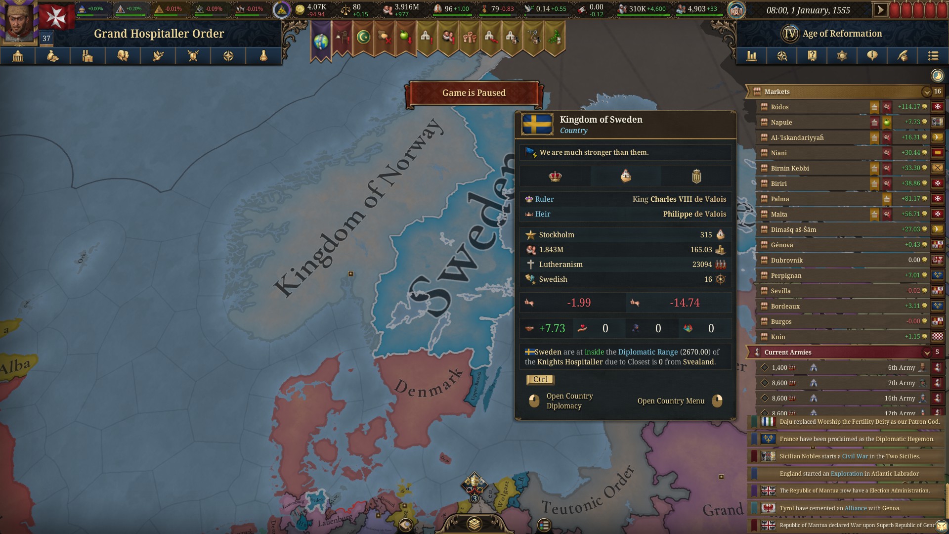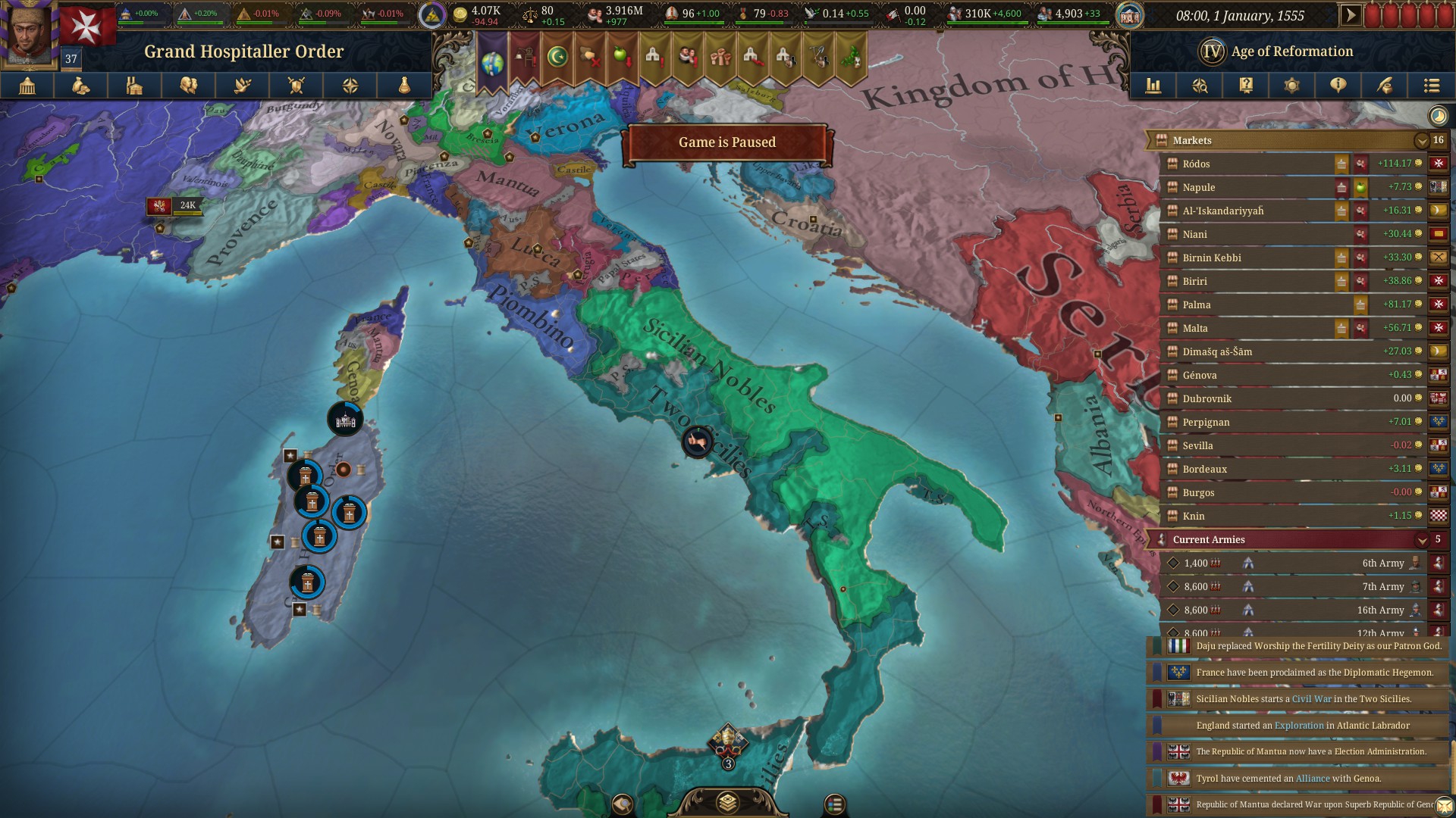 Йухан! Верни мне мои легионы! Как всегда, ни дня без Йуханобесия. Смена тега с Госпитальеров на Африку вызвала новый приступ. Пошёл ивент который спавнится при падении ордена, но Йухан забыл добавить проверку того, есть ли в игре тег который ФОРМЕР ХОСПИТАЛЬЕР. Есть вариантик передать Мальту некой КАУНТРИ. Заспавнить второй орден Госпитальеров игра не смогла, поэтому просто уничтожила провинцию. Теперь это провка без тега, без культуры с невозможностью реколонизации. Как в Стелларисе разрушенная планета. У меня по какому-то ивенту Марокко точно такая же провка организовалась в пустынных оазисах и по пизде пошёл весь автопокрас пустошей.