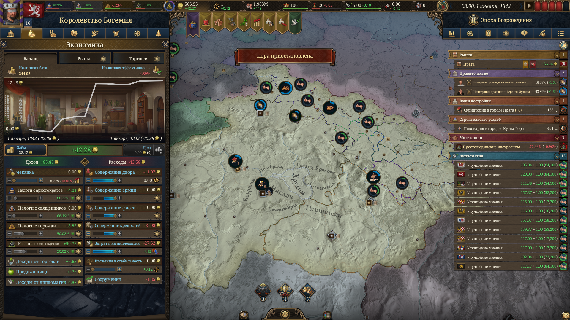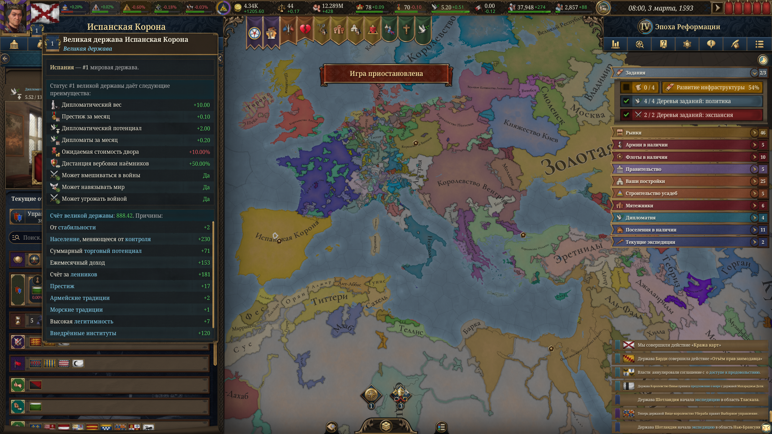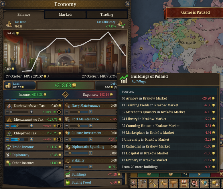 Как называется эта болезнь? Что может побудить ИИ заниматься такой хуйнёй? лишь 1/7 часть менпауэра бота на Франции в 1480 году используется, при том что на это уходит четверть экономики. Так же приложил Поляка, там всё нормально раскидано и он утопает в золоте.