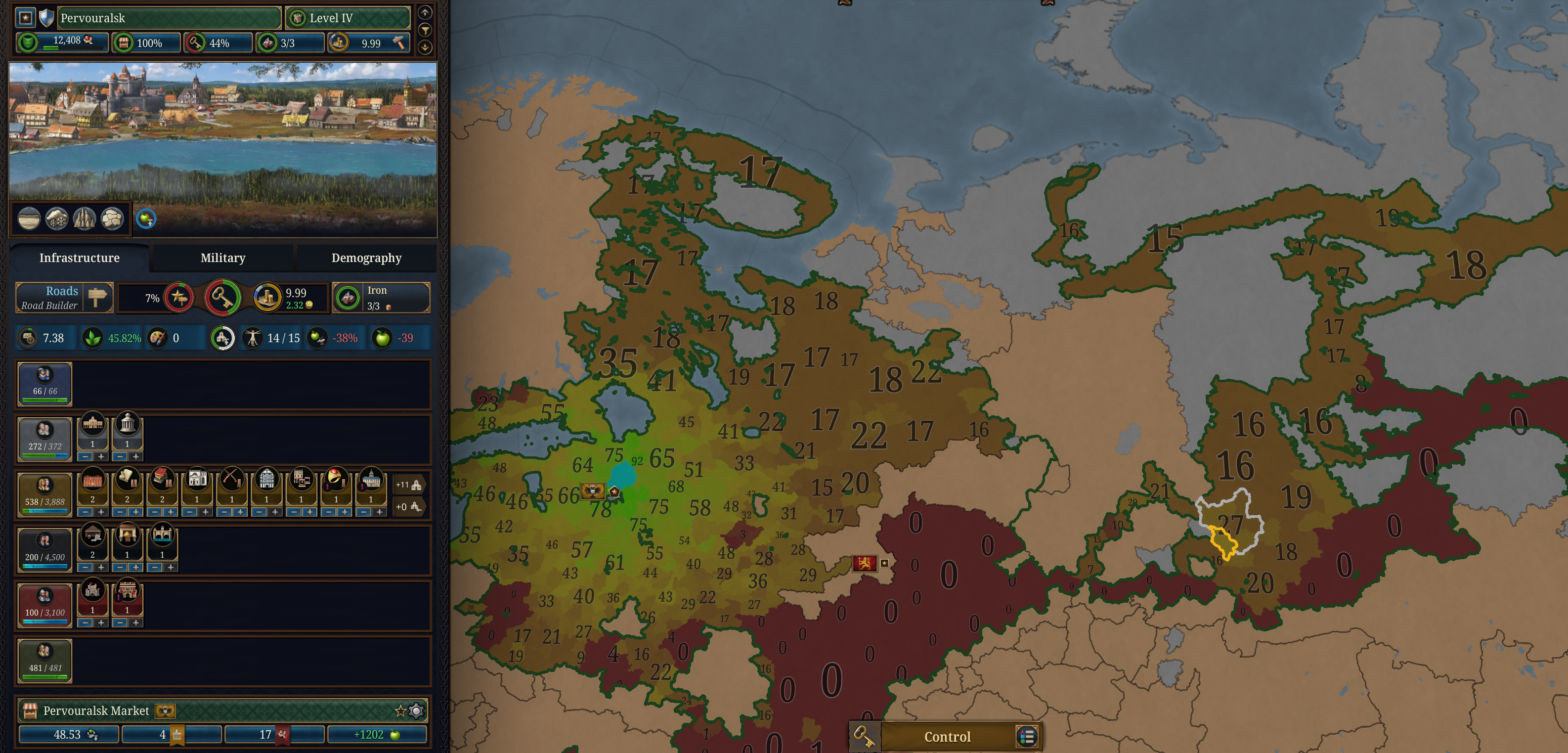 Почему дороги такое говно в начале? Протянул дорогу из Осло до серебряного рудника через 4 района и контроль вырос с 39 до 50. Может кораблики лучше строить? Так хотя бы через maritime presence на побережье контроль увеличу.