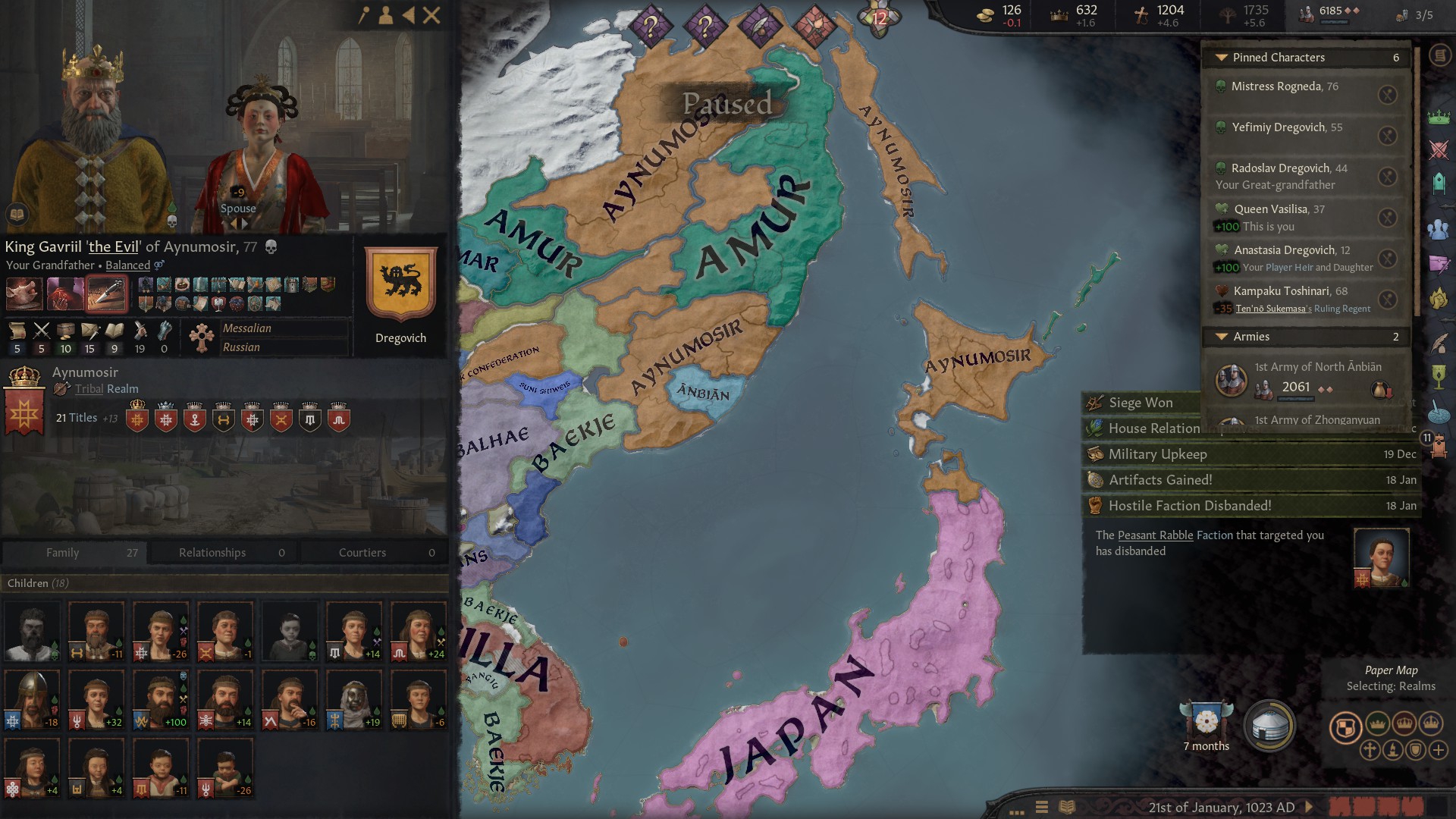 Хризантемовый трон должен быть самой интересной дрочильней из всех потому что именно там раскрывается механика блоков. Ты номинальный правитель японии - импотент без реальной силы и без земель вообще, лол, однако, если ты как следует надрочишь блок и отношения в нем на максимум до 3, предварительно выбрав правильную силу своего клана, то сможешь реальному правителю поднести хуй к носу через решения, сказав что тому пора съебывть, а ты восстанавливаешь реальную силу императора пиздоглазии. Как-то так.