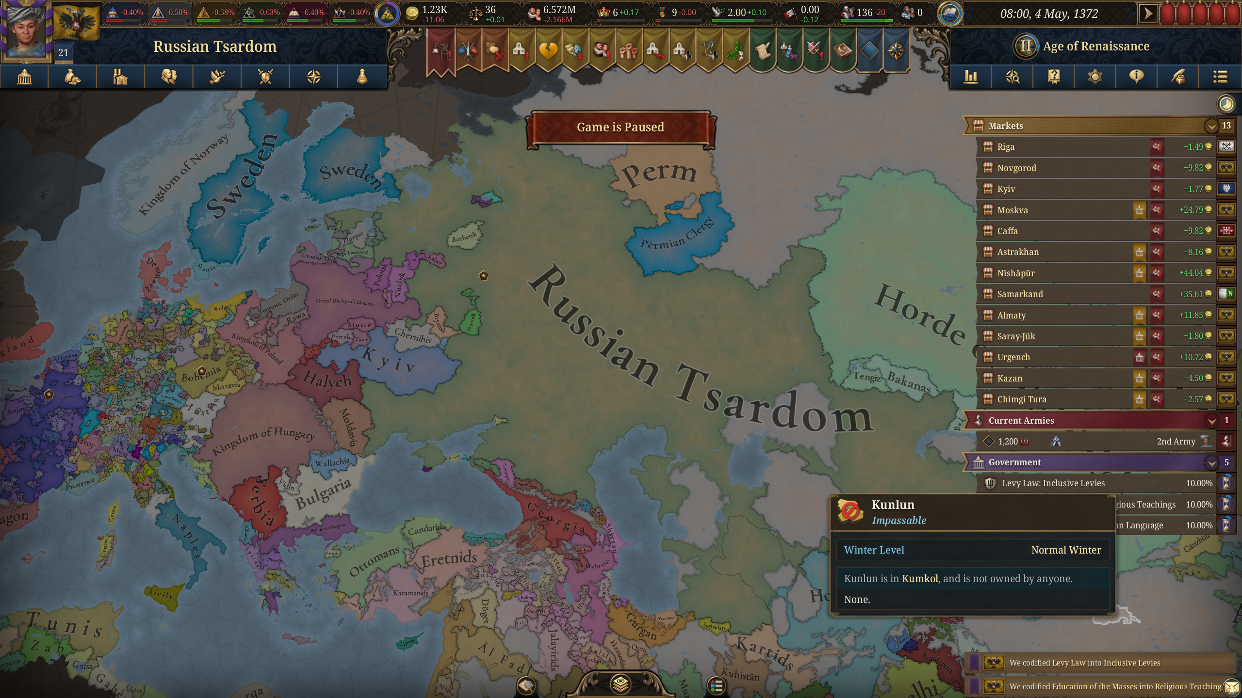 Или за Москву сесть, но это такая боль блядь... Кочевники пизды дать могут, рекрутов тоже на тоненького, бабла НЕТ нихуя, постоянные восстания, бегать своими 3 армиями подавлять бичей, будешь много жрать - ослоёбы в коалицию соберутся, союзников нет, институтов нет, бабки появятся только пробив червя в индию/персию/китай, до этого давись 3 развития в провах от кочевников..