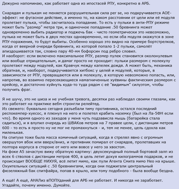 >>50439065 Эта хуйня с изменяющимися хитбоксами реально вымораживает. Буквально пару дней назад играл на итальянском леопарде 40/70. Скорострельнось хоть и небольшая, но обычно попасть в низколетящий самолет нетрудно. А тут внезапно, после того, как моя команда была изнасилована на земле и прижата к респавну, я последние десять минут раунда не могу попасть ни в один из пяти самолетов летающих над нами. Даже в сраный Ил-2, который вальяжно тарахтел надо мной на расстоянии плевка две минуты подряд. Естественно пошёл смотреть повтор: все трассеры пролетали реально в сантиметре от него, буквально царапая фюзеляж. С одной стороны - да, действительно вроде бы и не попадал. С другой стороны - какого хрена в других ситуациях хитбокс самолета в разы толще? Когда твой или вражеский пепелац убивает одной шальной очередью, пролетевшей в метре от реального местонахождения. И уже не знаешь, что винить последнее время: РПУ или сетевой спагетти код, который по-разному работает в каждом отдельном раунде и ломается при каждом обновлении.