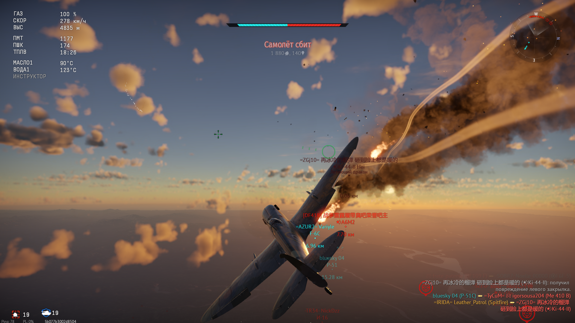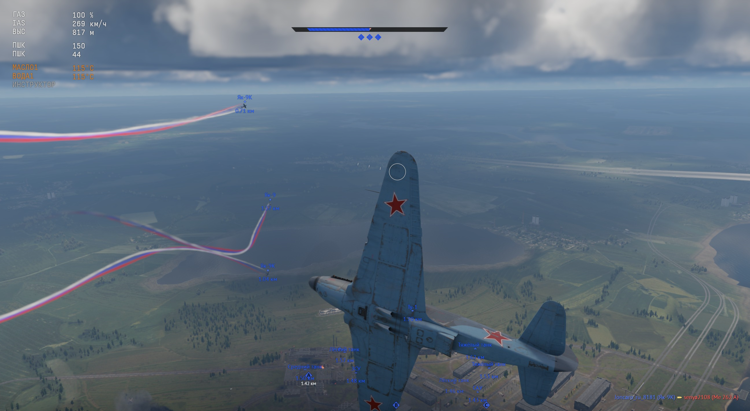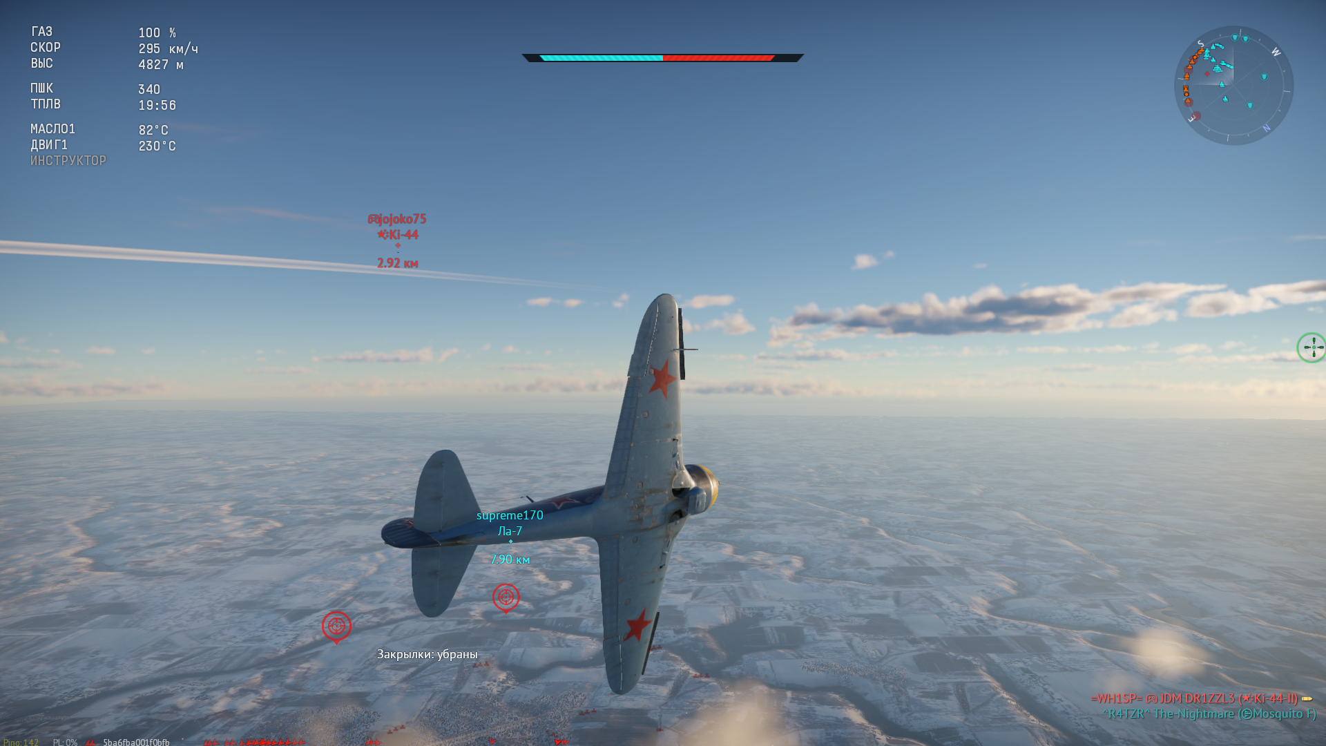 >>50441243 >>50449680 >>50451852 Вот в кои-то веки встретил относительно толкового Ки-44. Ну что я могу сказать, лавка против него действительно в заметном проигрыше, особенно на 4+км. Если бы семёра не помогла, в соло он бы меня ушатал скорее всего, даже не имажинирую, что можно было сделать в подобной ситуации, чтобы гарантированно получить преимущество, разве что надеяться на его ошибки и косую стрельбу. Со стрельбой у него было действительно хуёво, он довольно долго не мог в меня попасть и в итоге откис от Ла-7; стрелял бы он получше - мог бы сбить сначала меня, а потом и семёрочку тоже. Этот бой я по итогу закончил живым, но с нулём фрагов, лол.