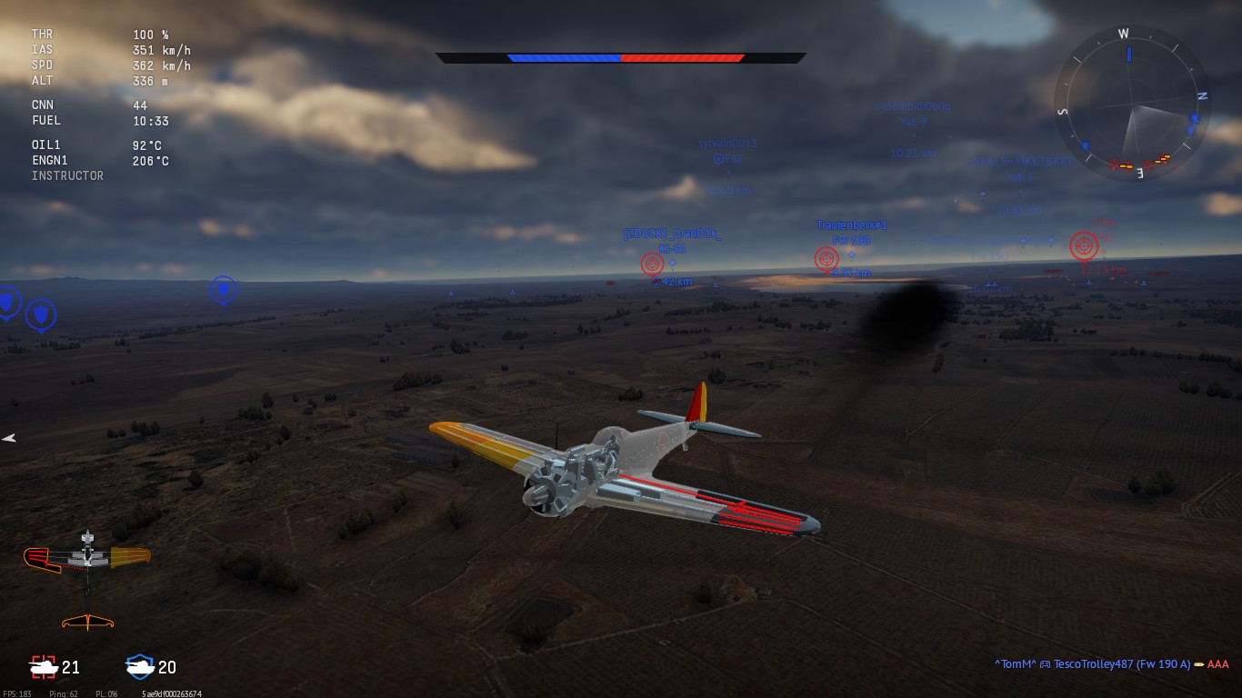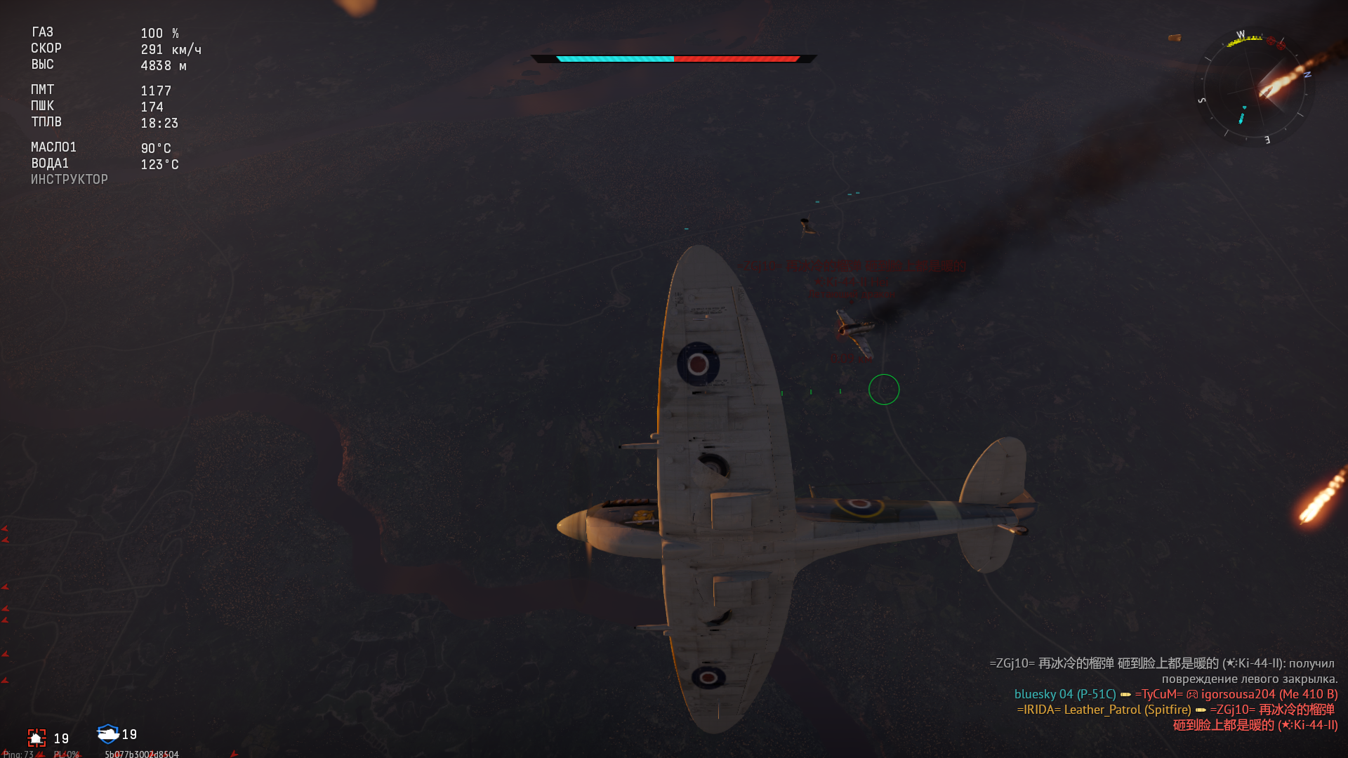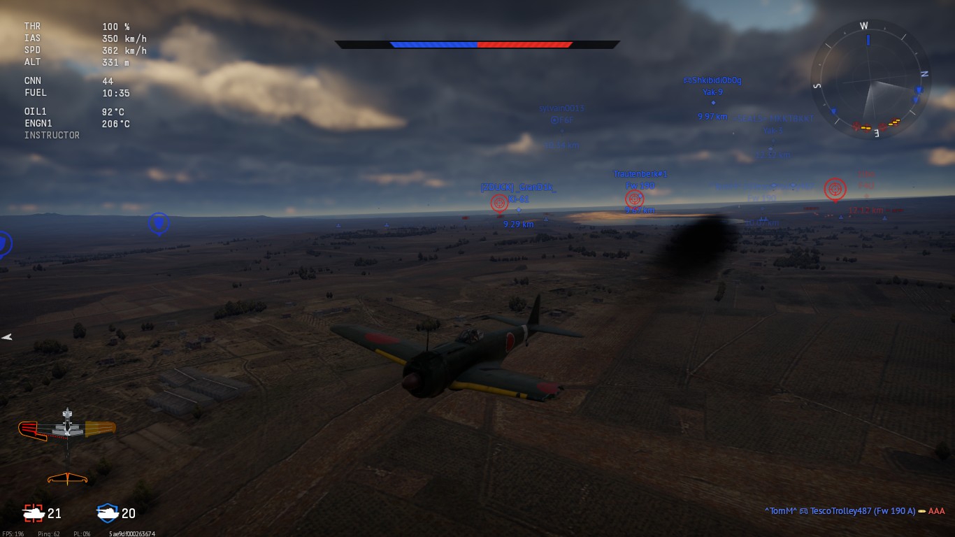 >>50441243 >>50449680 >>50451852 Вот в кои-то веки встретил относительно толкового Ки-44. Ну что я могу сказать, лавка против него действительно в заметном проигрыше, особенно на 4+км. Если бы семёра не помогла, в соло он бы меня ушатал скорее всего, даже не имажинирую, что можно было сделать в подобной ситуации, чтобы гарантированно получить преимущество, разве что надеяться на его ошибки и косую стрельбу. Со стрельбой у него было действительно хуёво, он довольно долго не мог в меня попасть и в итоге откис от Ла-7; стрелял бы он получше - мог бы сбить сначала меня, а потом и семёрочку тоже. Этот бой я по итогу закончил живым, но с нулём фрагов, лол.
