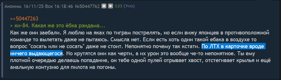 >>50451762 >ЛТХ в карточке фейковые, реальные в игре намного выше Ну не факт что выше. У той же Фоки А5 указан вираж 21 секунда, нот грейт нот террибл, чуть хуже среднего мессера, но лучше большинства амеров, жить можно. Но в реальности она ВООБЩЕ не поворачивает, хуже неё крутятся только самые уёбищные из Кувшинов и четырёхмоторные бобры, играть можно только на вертикали и никак иначе. >я если япов в противоположной команде на этом БРе вижу - на самолете в бой даже не выхожу, смысла тупо нет, если тип на Ки-44 захочет тебя сбить - он тебя собьёт и ты ему ни-ху-я сделать не сможешь. В схватке 1 на 1 против него победителем можно выйти только если он какую-нибудь откровенно тупую дичь сотворит, но рассчитывать на это обычно не приходится. А вот это ты зря. Странным образом я практически никогда не встречаю на 44ках ебак с кучей фрагов. Яки, лавки, спиты, лайтнинги, ХП50, пьйиромирские там всякие - регулярно видишь кого-нибудь с 4-5-6 фрагами. Но Ки-44 среди таких я, кажется, вообще ни разу не наблюдал (не считая себя, лол), ни китайских, ни джаповых. Они делают по 0-1-3 фрага и либо дохнут, либо выигрывают. Каких-то прям дуэлей с потными ладошками против 44ок я тоже не припоминаю - хотя могу назвать их целую кучу против хуяков, спитов, мемсеров или аэрокобр с ранними мустангами например. Возможно, потому, что облетаю Ки-44 по 7-километровой дуге и закусываюсь с ними только имея явное преимущество, лел. Какого-то охуенного винрейта у японцев на пропах я что-то тоже не наблюдаю.