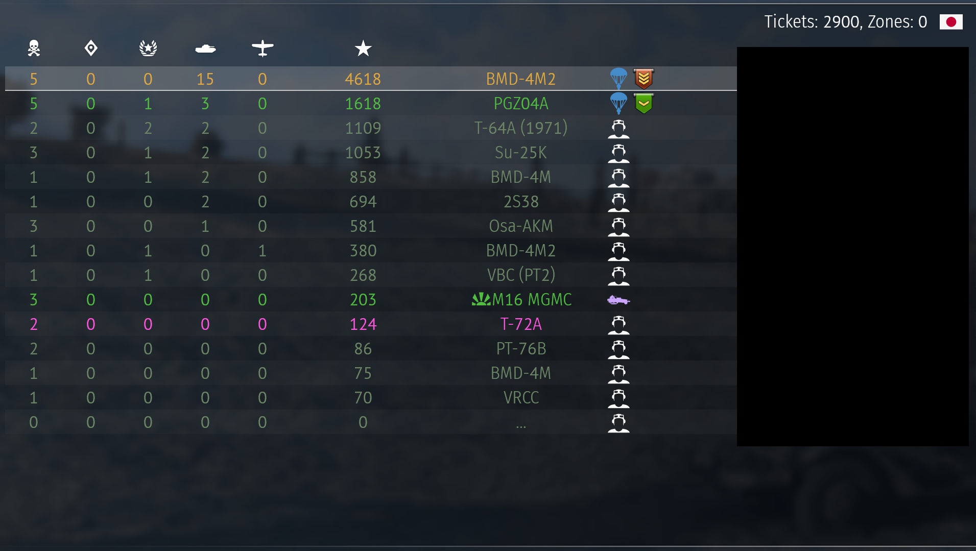 >>50450216 Брал первым спавном, да, в остальном мимо. Я там такие обходные курва-манёвры делал, закачаешься. Старался заходить со стороны вражеского спавна, искал тех, кто либо только выехал с респа, либо охраняет камень где-то рядом с респом. Что бы всё получилось слишком много факторов должно совпать. Должна карта выпасть хорошая, нужно, что бы цель стояла в удобном месте и желательно в гордом одиночестве, цель должна быть безобидной (этот гвинтокрыл разваливается буквально после первого же попадания 12.7) и глухой, что бы незаметить, что в 500м от неё вылез вертолет, плюс урон от ракет должен пройти, а вместо него может быть просто пачка критов и нихуя. Короче сложно это, так просто за несколько вылетов хуй сделаешь.