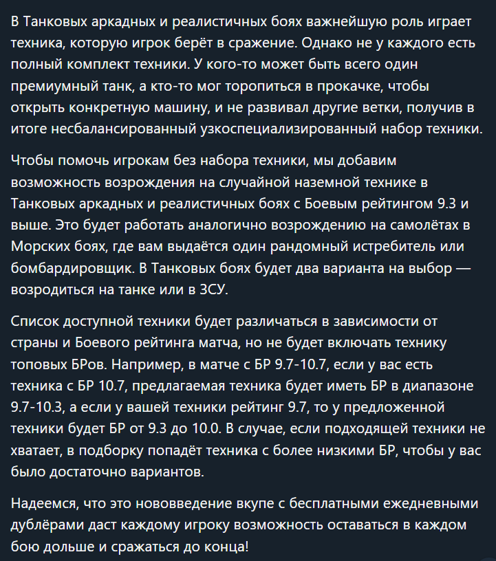 > We’ll be adding a random ground vehicle spawn option in Ground Arcade and Ground Realistic Battles in lineups of 9.3 and above. > options won’t be top BR in any given scenario