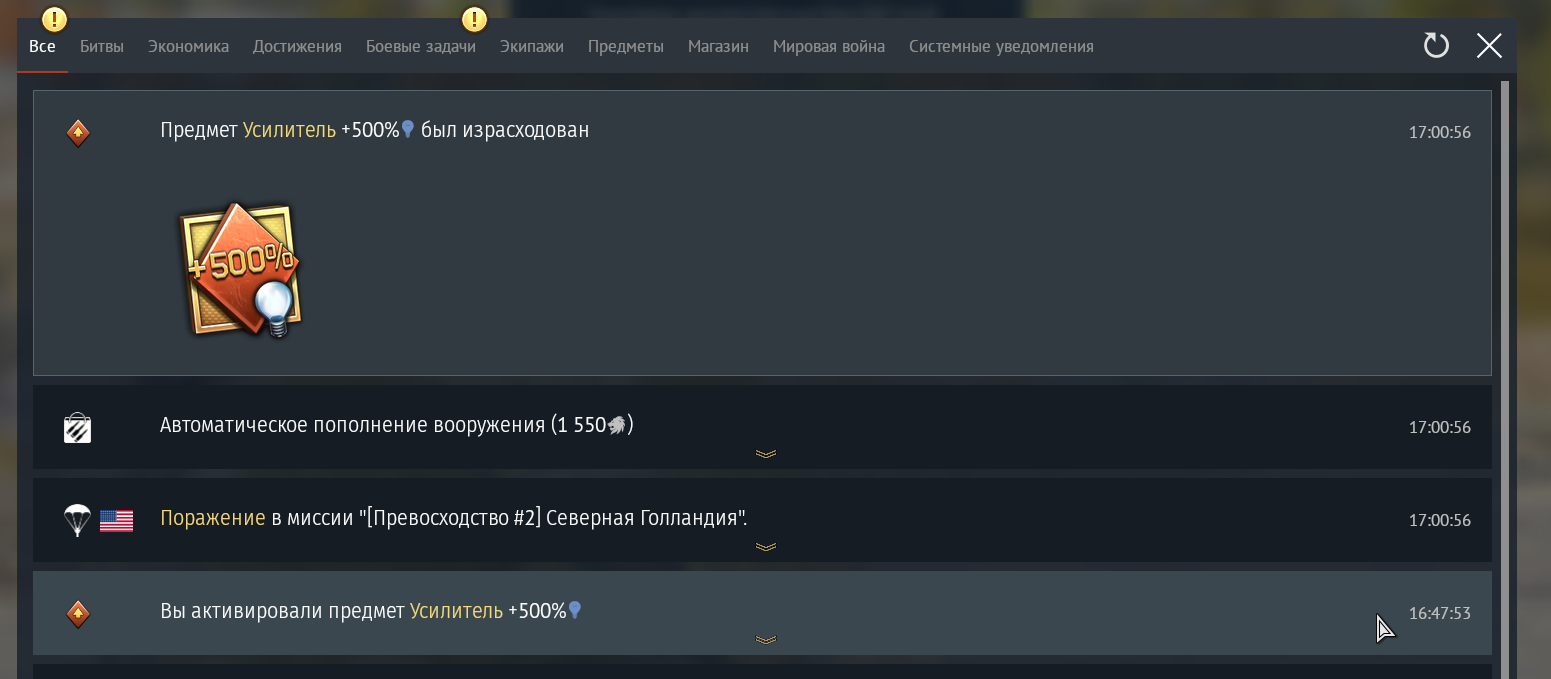 Я нихуя не понимаю как работают эти усилители на опыт. Заюзал на 500%, отыграл бой, в послебоевой статистике нихуя усилителя нет, пишут какие-то +30-с-хуем% опыта, банок насыпали кот наплакал, в статистике, которую потом можно посмотреть на закладке "Битвы" этот усилитель есть. Это баг какой-то, или я не понимаю как оно работает?