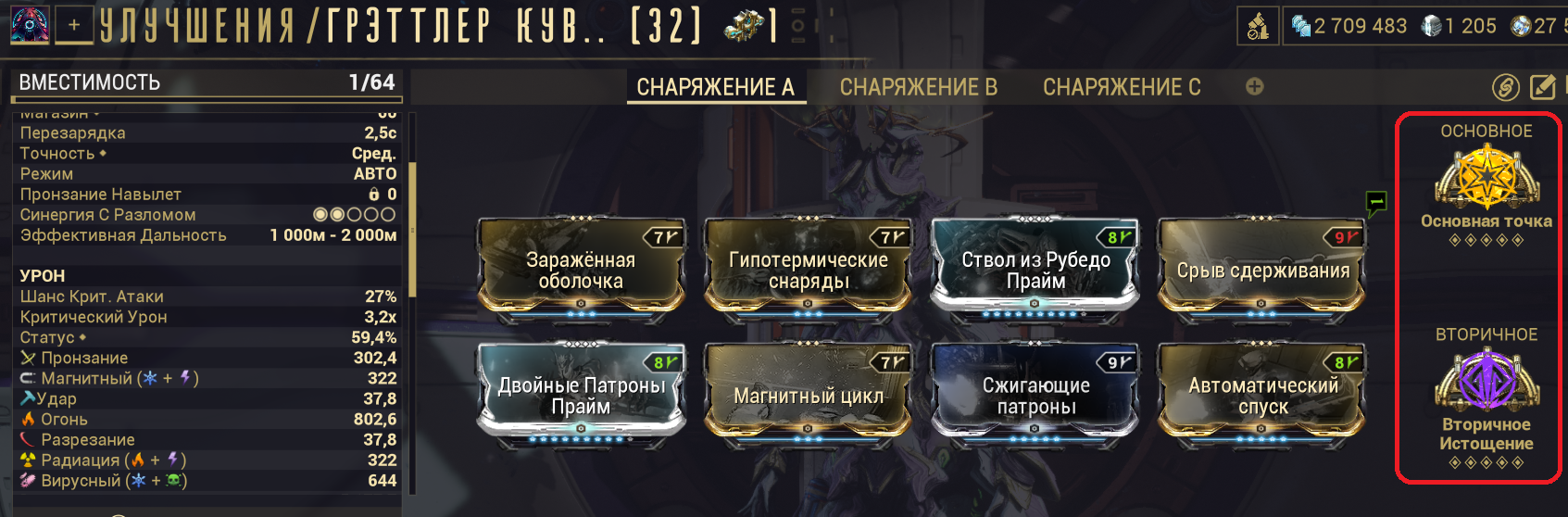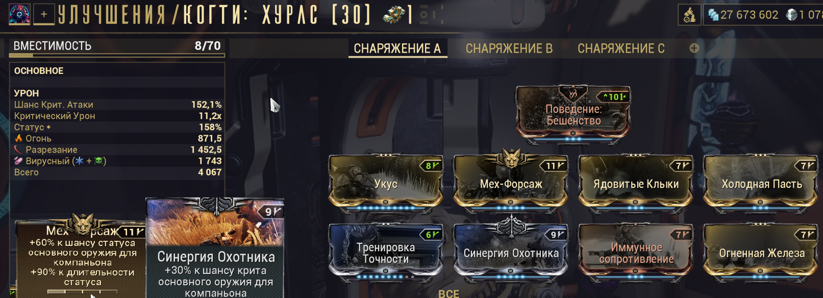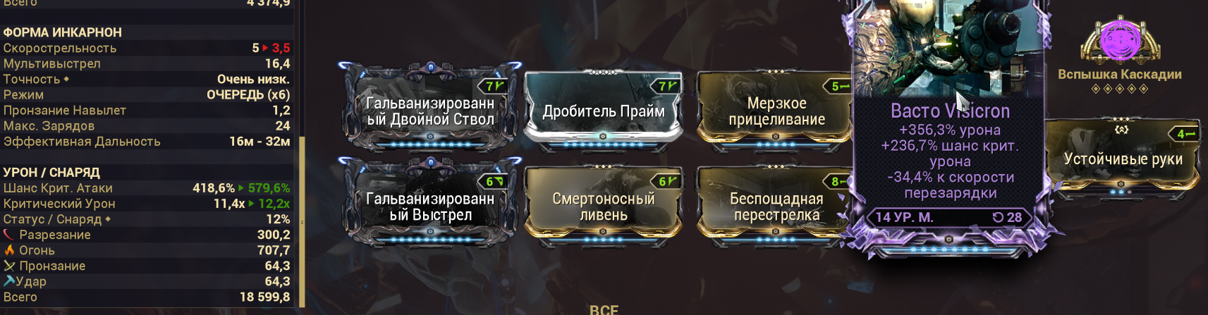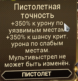 Из свежих модов на хедшоты - у нас есть основная точность и гальванизированный прицел. Первое - даёт дичайшие бусты и урона и шанса крита по уязвимым местам, второе - стакающийся шанс крита как у аргонового прицела, но круче.
