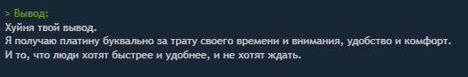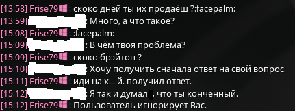 Бля вот срались эти двое выше пол ночи, а теперь представьте ебало тех, кто хотел что то втюхивать лохам при том, что у всех чат сдох. Даже Джайру по оверпрайсу не впарить. Да что там впарить - не пофармить нормально, ходи с рандомами и надейся, что повезет. Хорошо, что запасся платом и спокойно купил протовиспочку