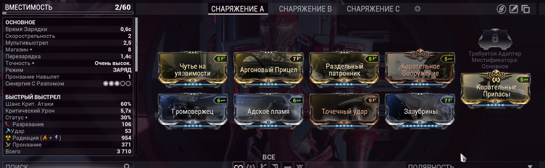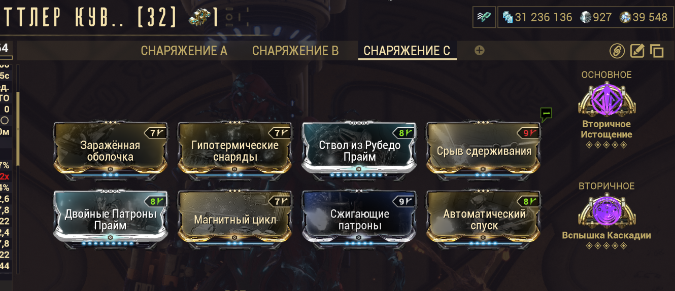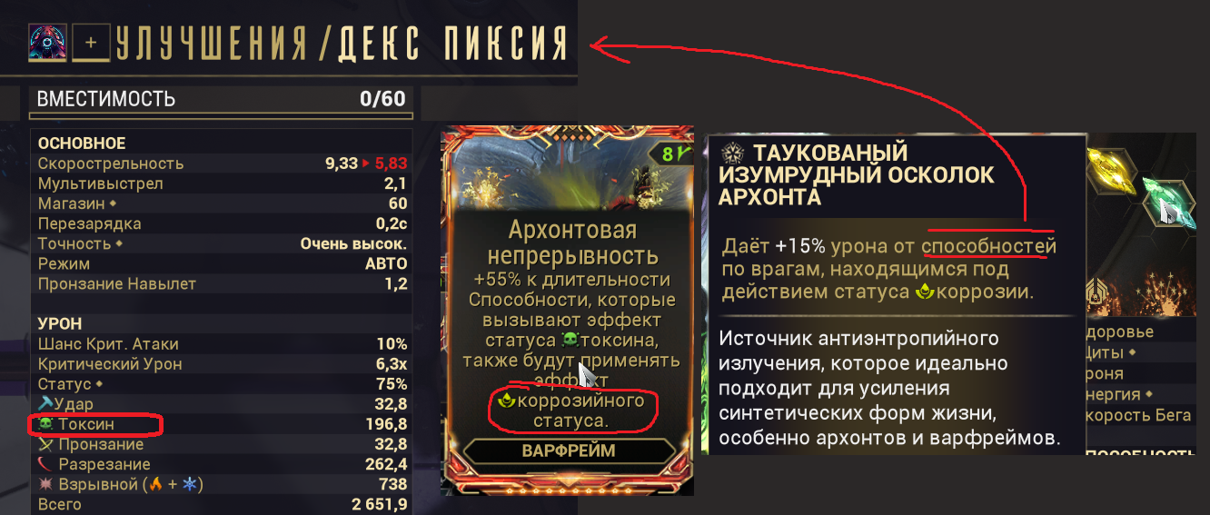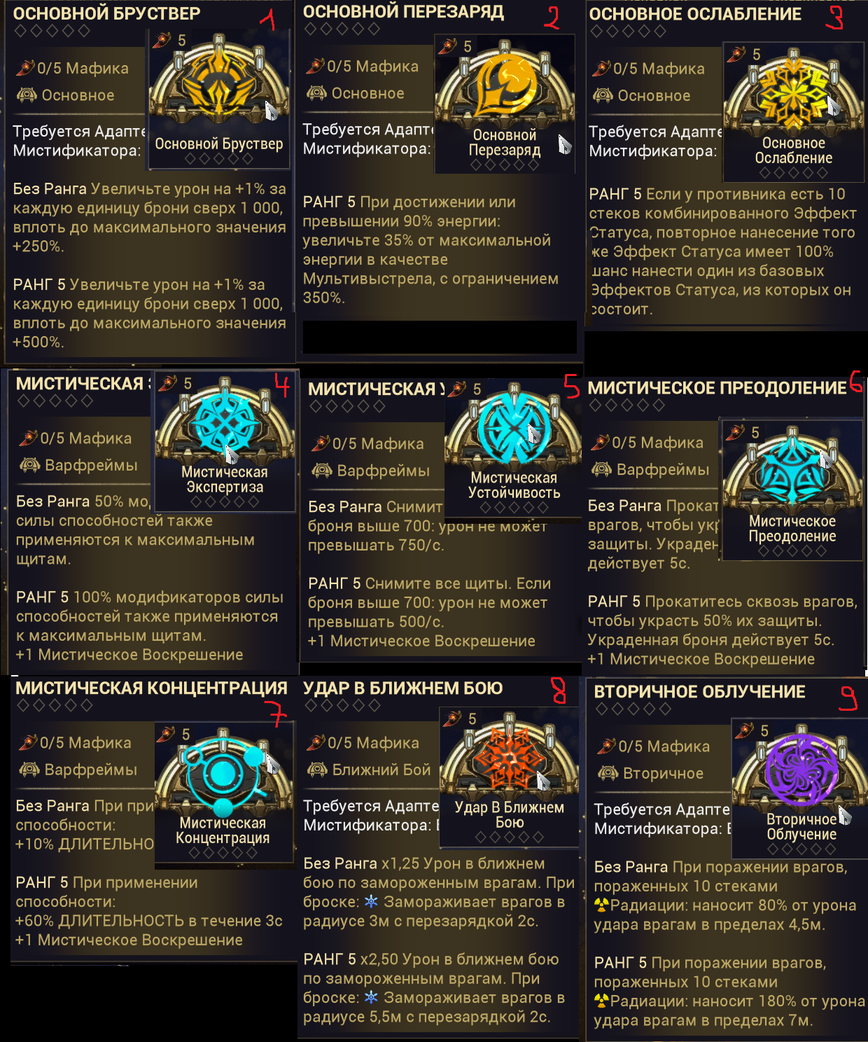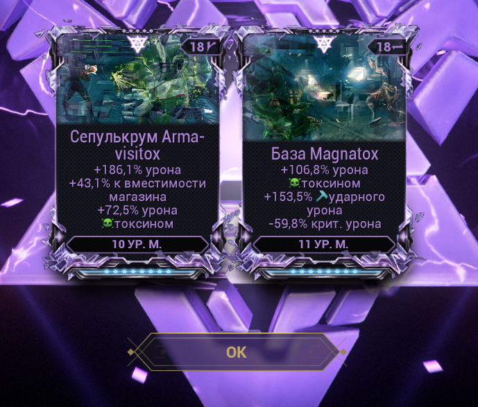 1. "+500% урона основе, если у вас 1500+ брони" - Постоянно настаканная безжалостность на +500% дамаги? Охуенно. Наконец-то мистик базового урона, работающий на эйдолонов. 2. "+350% мультика основы на рамках, с энергией > 1000". С одной стороны пиздос, с другой - для фул настака (1к энергии) проще всего добиться тонной брони и мистической батарейкой. 3. "Долбёжка по мобам с 10 стаками комбинированных статусов вешает один из базовых статусов из этих комбинированных" - пиздос. "Вторичное обременение" для основы, если воткнуть в ту буквально пару модов - на радик и на магнит. Ну, и добить одним модом на токсин. Охуенно себя покажет на коррозии (электро + токсин - дамажные статусы, а коррозия даст аоморстрип) И на газе (газ + огонь + токсин - дамажат, огонь при этом стрипает позволяя дамажить лучше и настакиваться).