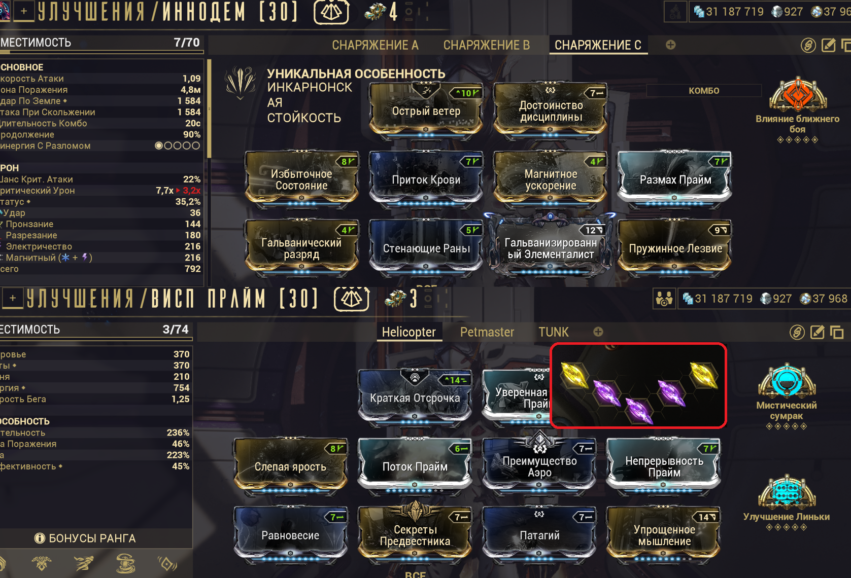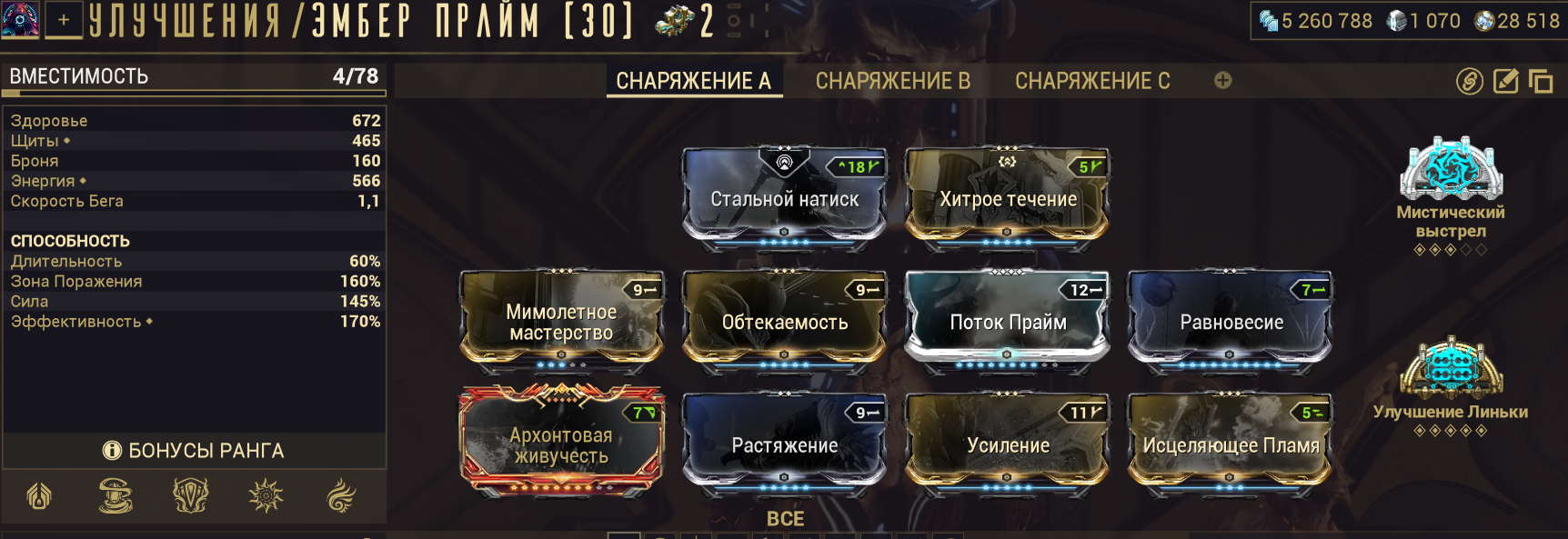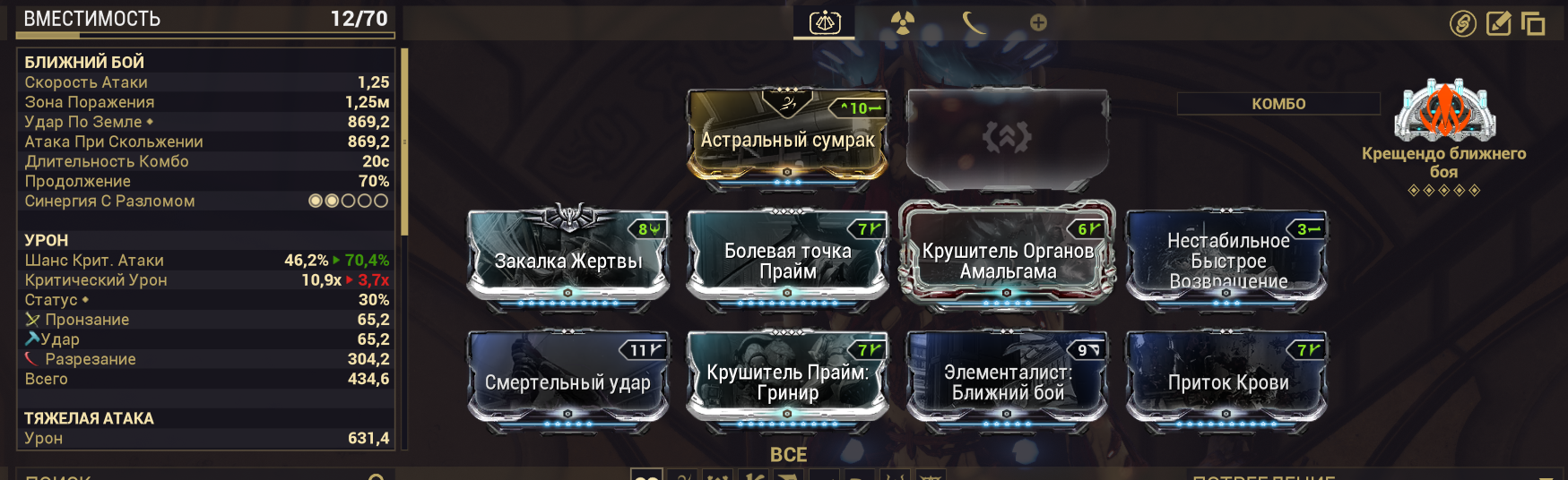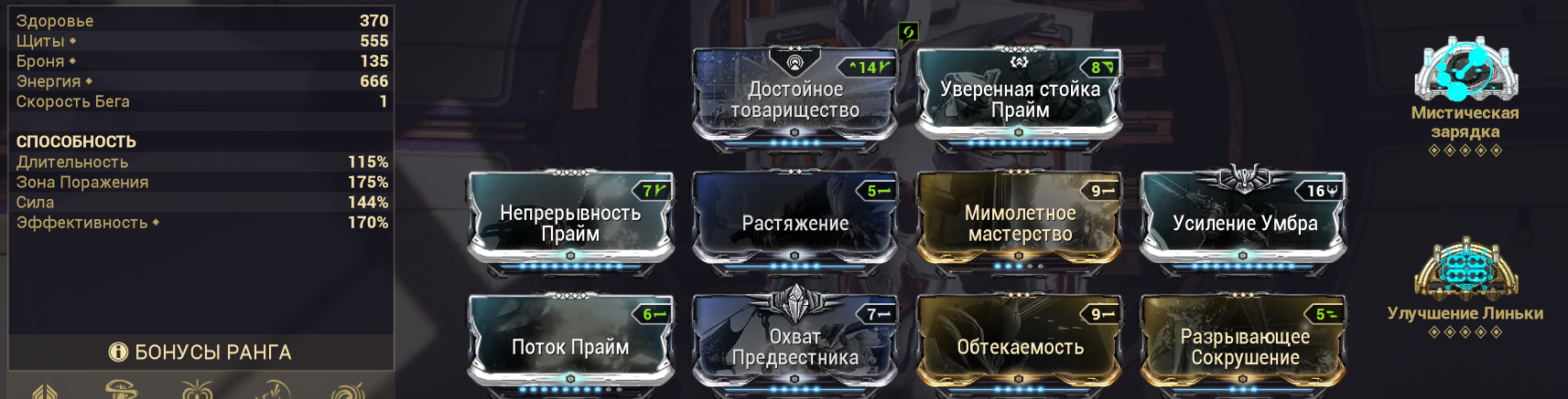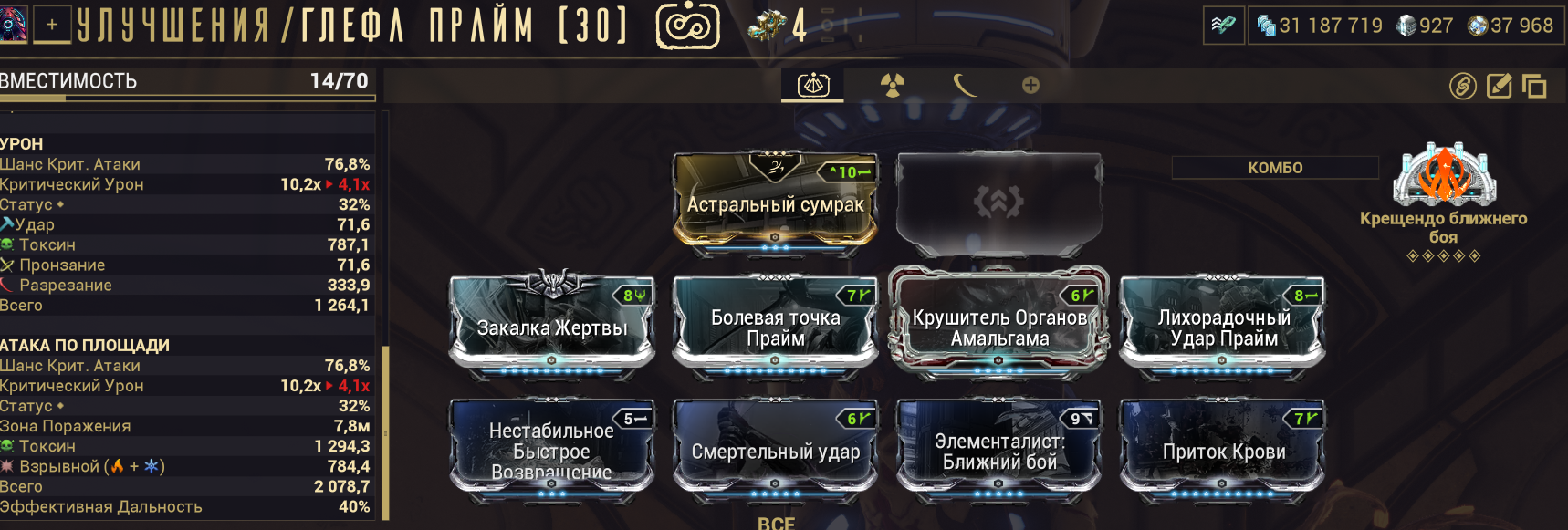 1. "+500% урона основе, если у вас 1500+ брони" - Постоянно настаканная безжалостность на +500% дамаги? Охуенно. Наконец-то мистик базового урона, работающий на эйдолонов. 2. "+350% мультика основы на рамках, с энергией > 1000". С одной стороны пиздос, с другой - для фул настака (1к энергии) проще всего добиться тонной брони и мистической батарейкой. 3. "Долбёжка по мобам с 10 стаками комбинированных статусов вешает один из базовых статусов из этих комбинированных" - пиздос. "Вторичное обременение" для основы, если воткнуть в ту буквально пару модов - на радик и на магнит. Ну, и добить одним модом на токсин. Охуенно себя покажет на коррозии (электро + токсин - дамажные статусы, а коррозия даст аоморстрип) И на газе (газ + огонь + токсин - дамажат, огонь при этом стрипает позволяя дамажить лучше и настакиваться).