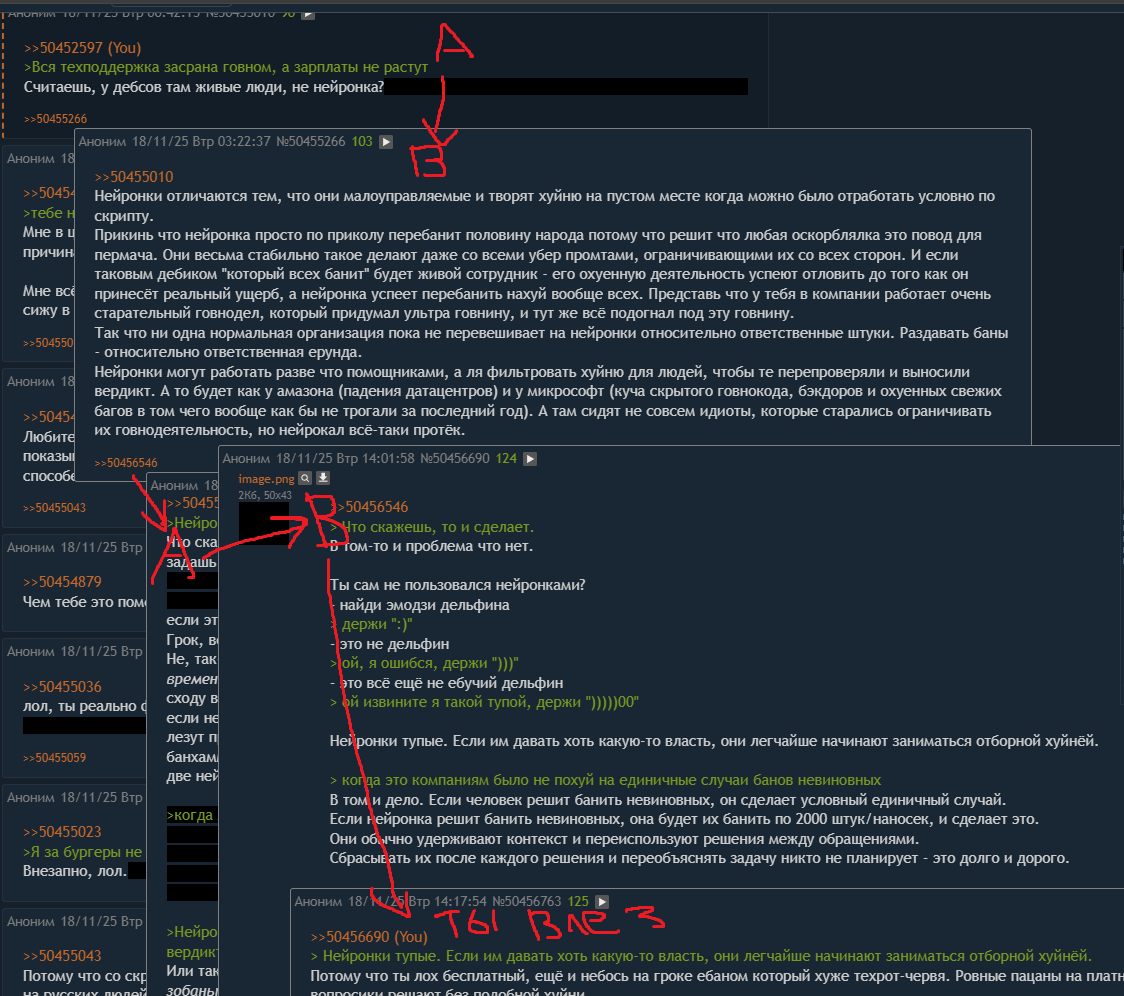 >>50455266 >Нейронки отличаются тем, что они малоуправляемые и творят хуйню на пустом месте Что скажешь, то и сделает. Скажешь банить за любые, будет банить за любые, скажешь действовать сложнее и нормально задашь правила - будет действовать сложнее (я, если что, не теоретизирую, есть опыт использования нейронок для сортировки куч инфы по множеству взаимопересекающихся признаков, справляются не идеально, но достаточно хорошо, чтобы ошибки были единичными; и давай честно, когда это компаниям было не похуй на единичные случаи банов невиновных, если эти невиновные немедийны). Грок, вон, 2д-тянку по промпту изображает и в основном норм. Не, так-то да, с нейронкой обосраться просто ("развитие технологий позволяет совершать больше ошибок в единицу времени" или как там это), если неосторожно подойти; скажем, по твоему "нейронка успеет перебанить нахуй вообще всех" сходу вопрос, а что мешает ограничивать банрейт, ну, условно, статистика по числу нарушений у дебсов наверняка имеется, и если нейронка превышает некий лимит банов в секунду/минуту/час/etc, то от банхаммера она отключается и живые челы лезут проверять, что вообще происходит (опционально плюс промежуточный, более мягкий лимит, при достижении которого банхаммер не отбирается, просто поднимается флажок, мол, чот баны активно пошли, гляньте, там точно ли все по делу). Ну две нейронки возьмите, блять, пусть вторая первую чекает и только если обе согласны, что это бан, чел реально банится. >когда можно было отработать условно по скрипту Если ты про скрипт для человека - это сравнительно дорого, а у нас же обсуждение началось с расходов (≈"работы много, а денег нормально платить нет"). Ну и кстати, можно и биороботам людям со скриптами так работу поставить (случай скриптом не предусмотрен, право на отклонение от скрипта отсутствует, второй линии поддержки с большими правами нет или перегружена, зато дешево), что они станут творить временами абсолютную дичь.