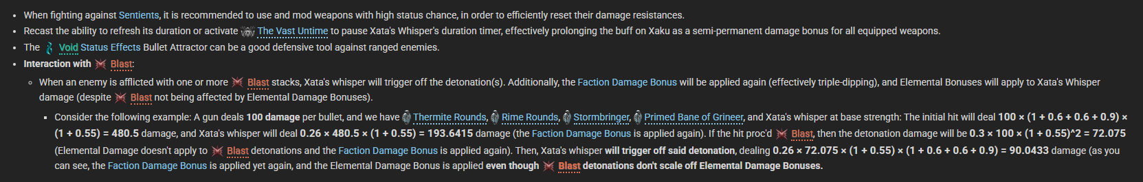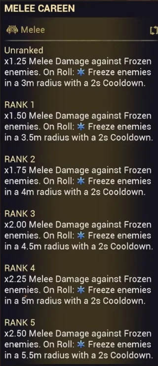 7. "+60% длительности способностей на 3 сек за каст абилки" - наканецта нормальный мистик для спамеров абилками. Люблю спамить абилками. 8. "х2.5 урона ближки по замороженным врагам, замораживает (перекатом/прыжком-выстрелом?)". Вроде бы х2.5 выглядит как охуенный буст, но реально жирные цели, вроде некракеков или боссов или аколитов или демолистов, заморозить вроде как невозможно из-за капа статусов. Если эта штука замораживает через кап статусов - охуенный инструмент контроля боссов и множитель дамаги. Если нет - юзлес. Все на кого оно действует - и так рассыпятся без множителей, а множитель не работает на цели которые реально важно пробить. 9. Мили инфлюенс на статусных вторичках. Особый рофел будет со вторичками и так со здоровой зоной поражения - цели внутри этой зоны будут нахер лопаться перемножая урон между собой. Должно быть мемно на кокукоре, кста. И на нукоре.