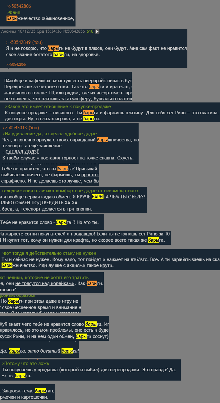 >>50452423 И в чем суть диалога? Судя по всему ты спамил в трейд чате списком ривней, мог бы на его вопрос ответить скок брэйтон, а начал "хочу получить сначала ответ...". Берешь-нет, все. У меня все нормальные трейды были короткими и по делу, торговались иногда. Все, кто хочет поговорить какие то ебанаты.