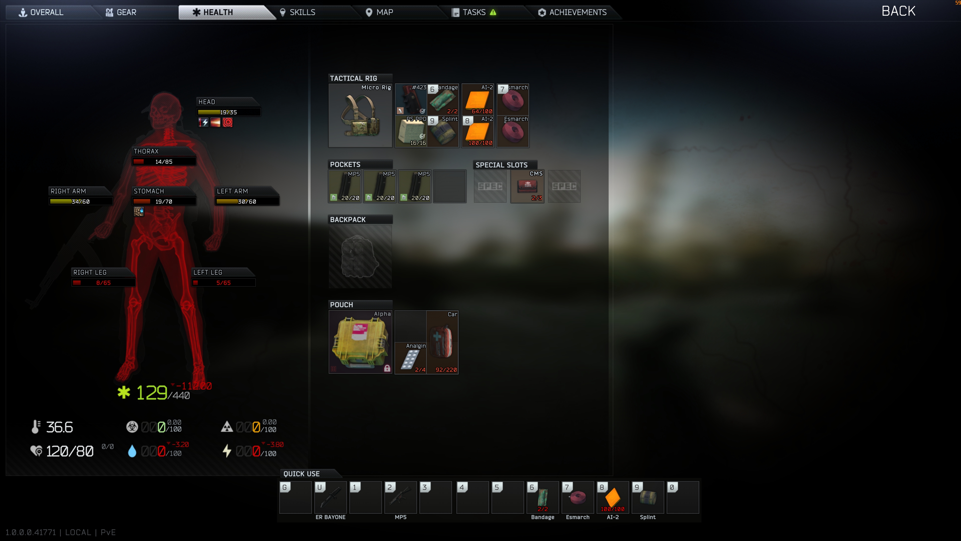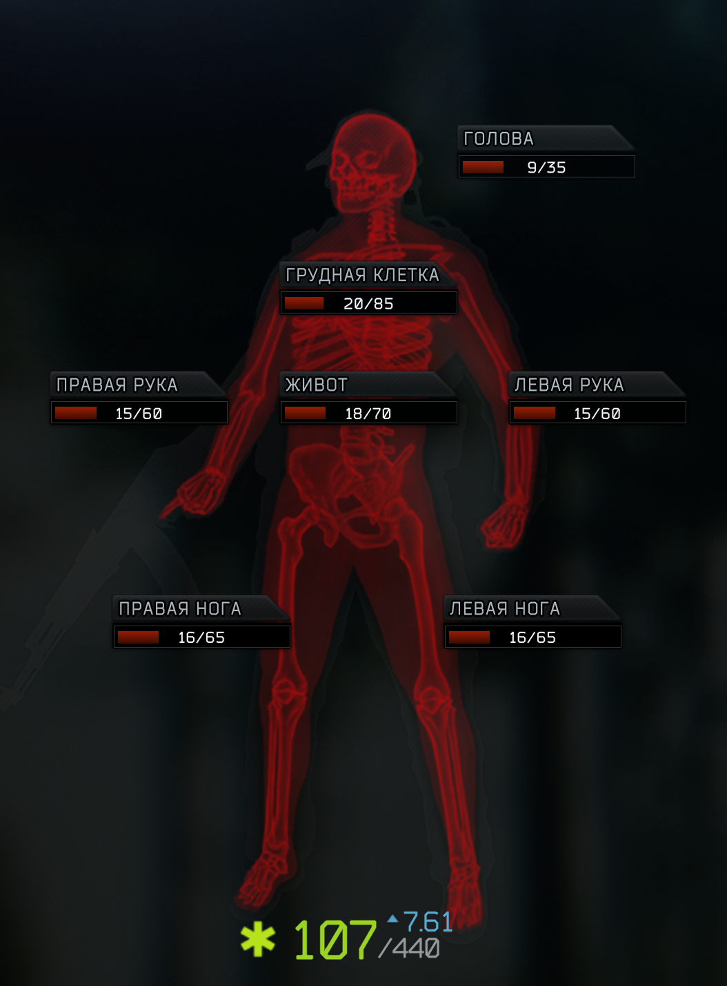 Я сдаюсь не могу так играть. Может еду надо есть? Я сундук полутал, пяти мянут не прошло со старта. Так мое чмо РЕЗКО начало стонать. Все конечности поломались за пару минут - жри не жри аптечки умер опять ничего кроме аптечек и таблеток нельзя применить. Никто меня не бил. Вокруг вообще никого не было.