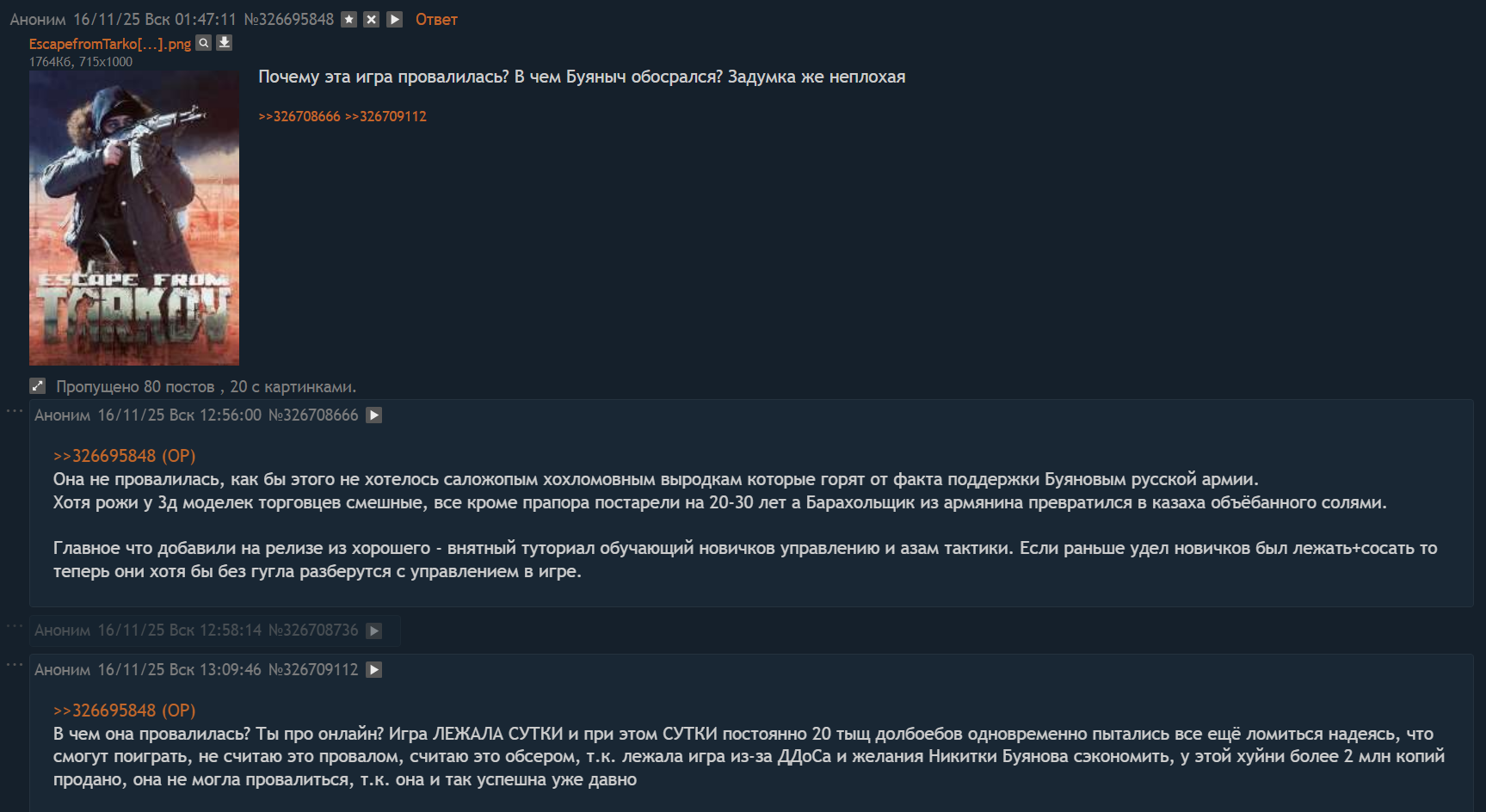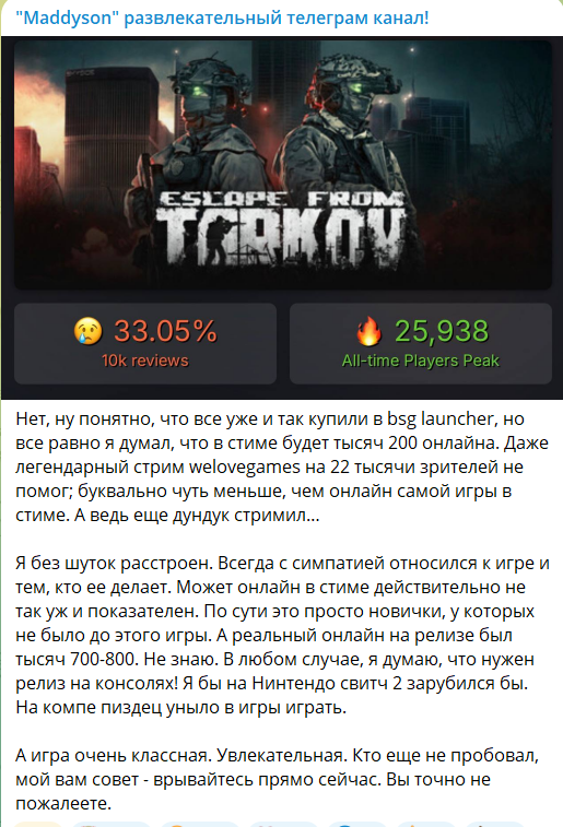 Ну никитосик нагрел стимовских гоев все таки, пару сотен тысяч копий по любому продались. Самые терпеливые говноеды дождались когда сервера пропердятся и можно будет поиграть, приятного аппетита. Но какой же потенциал упущен это лол. Только представьте сколько было бы бабла заработано еще, если бы тарков работал получше в эти выходные. Самый хитрожопый толстый из геймдева придумал темку как снять сливки с популярности нового экстракшон шутера в стиме и ради этого завернул проходной патч в обертку релиза. В принципе план был неплохой, потому что для новичков контента в таркове достаточно, это был расчет на новую аудиторию. Но критическая ошибка была дата выпуска патча. Надо было делать релиз в пятницу днем, чтобы сервера успели пропердеться к воскресенью. Но видимо никитка был так уверен в своей гениальности по наебу стимовских гоев, что даже не мог предположить обсер говнокодеров из бсг.