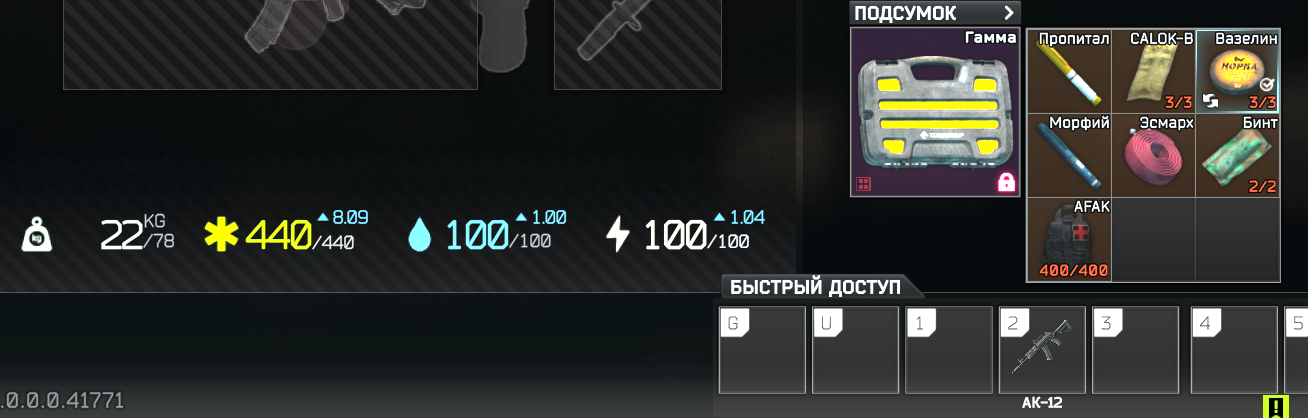 >>50449918 Ебать бро, ты бы ПОЕЛ и ПОПИЛ. Без еды ты не сможешь передвигаться, а без воды - да, тебя будет дамажить тиком каждые пару секунд. В етой игре надо есть и пить да. Обезболы жрут запас питья например, еда некоторая жрет воду, так что в рейд брать водичку надо и еду, обычно только водичку потому что еды везде полно. Вода тоже есть но она уходит пиздец. И да, после рейда эти параметры не восстанавливаются мгновенно. надо прям жрать и пить вне рейда, или качать убежку, она ресает это но быстрее если прокачать. Но тоже не мгновенно. Обычно как происходит у меня игра - сбегал на ЧВК, в рейде жрешь пьешь пару раз чо нашел. Всегда например беру 1 слотовый пакет водички, на крайний случай если сушняк пробьет. Выходишь из рейда - либо попил поел сразу, либо идешь на дикусе сразу, в это время чвк в убежке атдыхает жрет пьет пассивно сам. Я думал люди которые идут в Тарков хотя бы видосы обучающие посмотрели, што ж ты так.