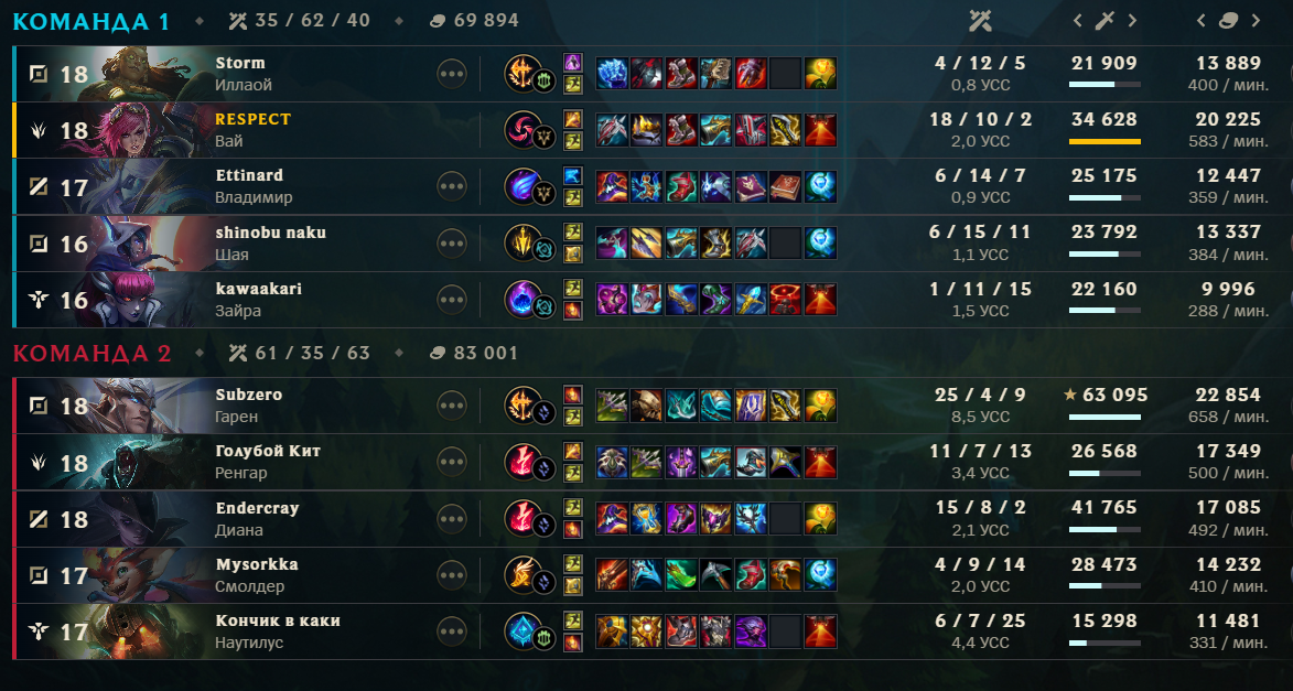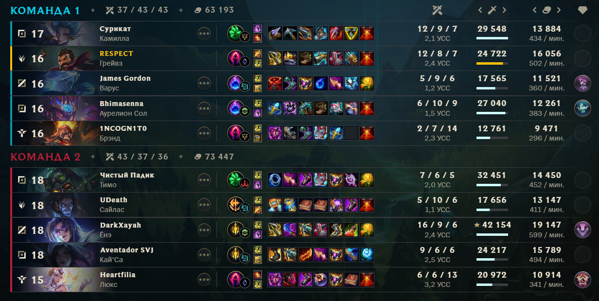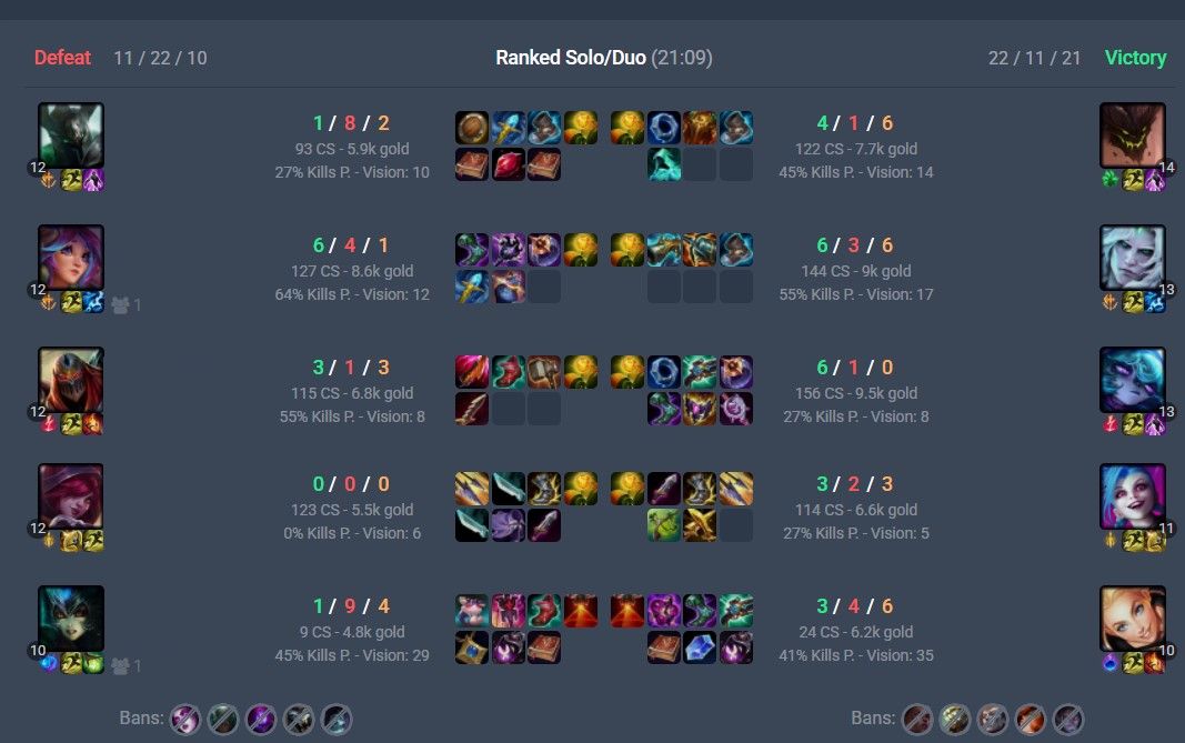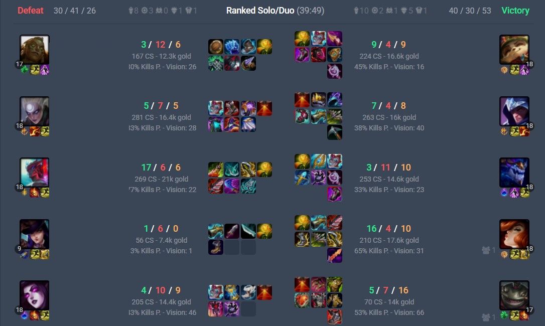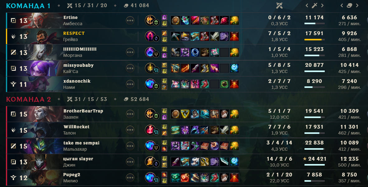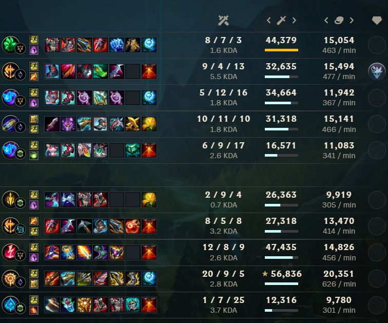 Абсолютно балансный рито матчмейкинг. До последней секунды было неясно, кто победит. Все бились, как львы и зубами выгрызали победу. Интрига сохранялась до последнего момента. Ну, а то, что 0 обьектов, и счет по убийствам в 4 раза разнится - так это случайно. Ведь все в рамках баланса. Силы были абсолютно равны. Никто не фидил и ни одна линия не была гапнута. За это лигу и любим.
