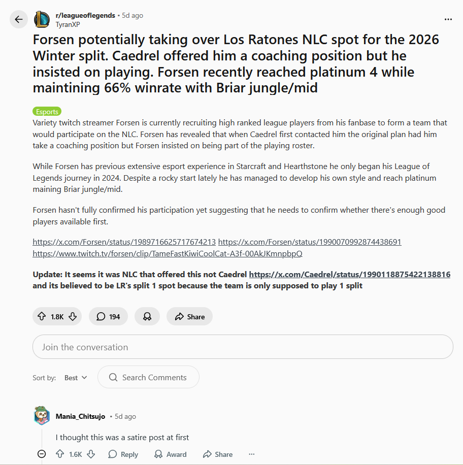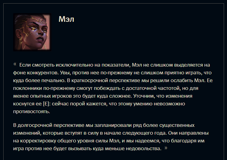 >>50464385 Рито попыталось впихнуть в лес с десяток чемпов, обьясняя это тем, что люди не любят автофилл и в целом винрейт и юзер экспириенс ухудшается, особенно, если автофильнутый лес играет против мейнера-лесника и автофильнутому нужно еще и пилотировать незнакомого чемпа, а его мейн с топа неиграбельный. И вот, чтоб помочь в этой ситуации, если кого-то кидает в лес, то чтоб хотя бы знакомым чемпом мог крипочков побить, за которого кнопки умеет жать. С десяток чемпов получили прямые баффы бонусного урона по лесным крипам, среди них физз, атрокс, амбесса, чогат, джейс, мальфит, орнн, ривен, сион. Как-то так.
