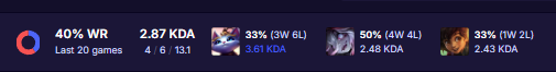 Никогда кстати не понимал этого перемога вром и играми. Это очень редко пишут люди 80%вр 50игр, в большинстве случаев это пишет чел у которого 55% вра на 100 ну и очевидно он претендует ровно на тоже эло как и чел на которого он бейби рейджит. Типа да и в чём смысл, если любой даже сильвер возьмёт ж4 аккаунт, он к моменту как своего эло достигнет у него будет там эти же 55% вра, а то и побольше. Всегда считал это просто детектором того что у какого-то фрика сгорело.