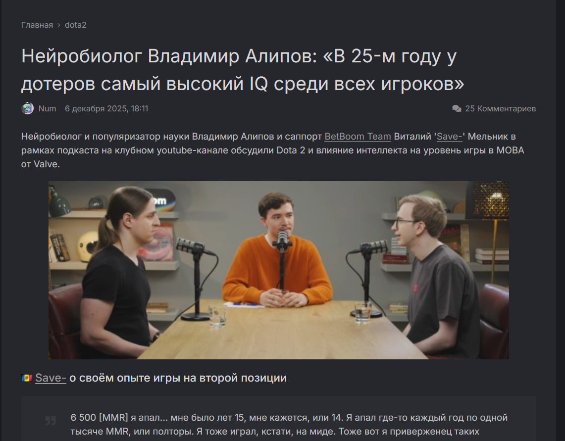 >>50540538 А вот мой рейд-босс из одной из последних игр. Чудовище расфидили настолько, что лень было даже крипов фармить. Просто кэжуал прогулка и трипл-киллы сыплются. Первая квадра уже на 7й минуте. Полтора айтема (не считая стартовых) и Т2 сапог на 12-й минуте. 22 фрага на 17-й. Любому тиммейту, кто был рядом, достаточно было сделать обычную автоатаку по каждому в файте или просто самый слабейший аое вспук , чтоб гарантированно получить 3-4 ассиста. Жаль, конечно, таких рейд-боссов у меня никогда не бывает.