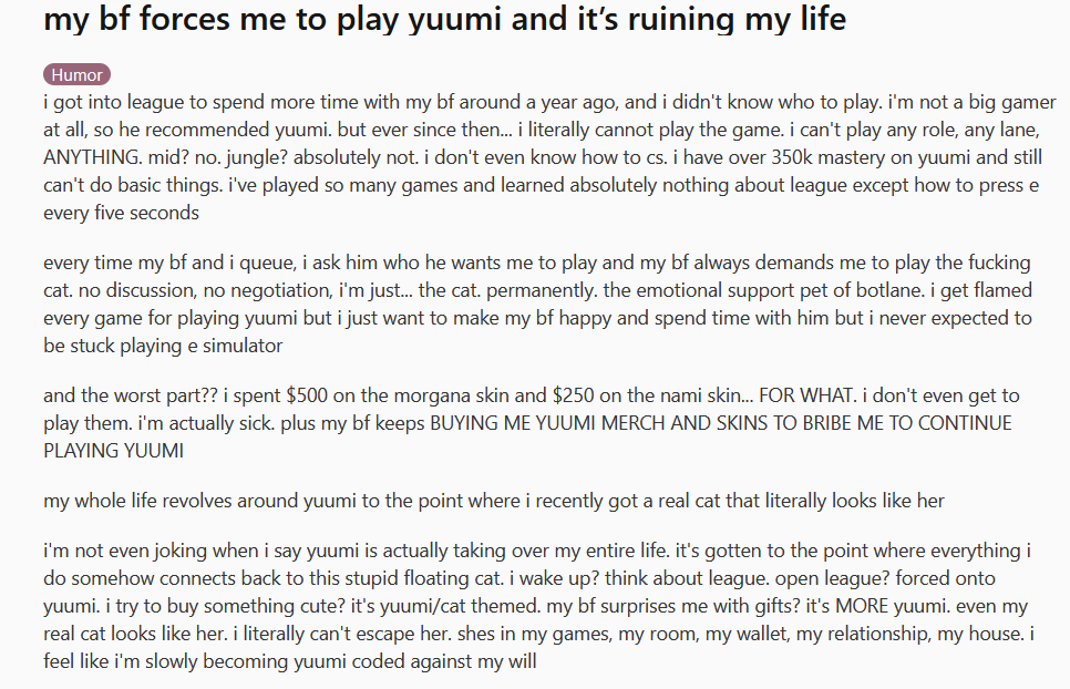 Как называется болезнь? играть на моргане в лесу, иметь 0/6/6 по игре и 6к дмг за 25 минут игры, ни одного объекта, но обвинять Юми за пик юми, юмихейтеры, признайтесь, вы же больные долбаебы. вы видите юми в тиме и у вас чет заклинивает в голове, то что вы обосрались с подливой по игре и пикаете моргану в лес это норм, а юми виновата. Бля почему в любой онлайн игре аудитория преимущественно дегенераты, эт проклятие любой онлайн игры