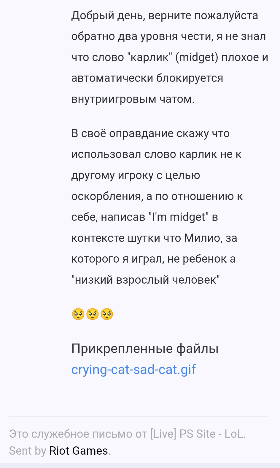 Не, это, конечно, приятно для разнообразия, когда в 1 из 20 игра в тильт загоняют тиммейты врага и он всю игру спамит капсом в олл чат. Но я за гораздо более мягкие высказывания получил неделю мута + сброс хонора с 4-го уровня на 2-й. А насчет этого мундо не было никаких уведомлений о наказании.