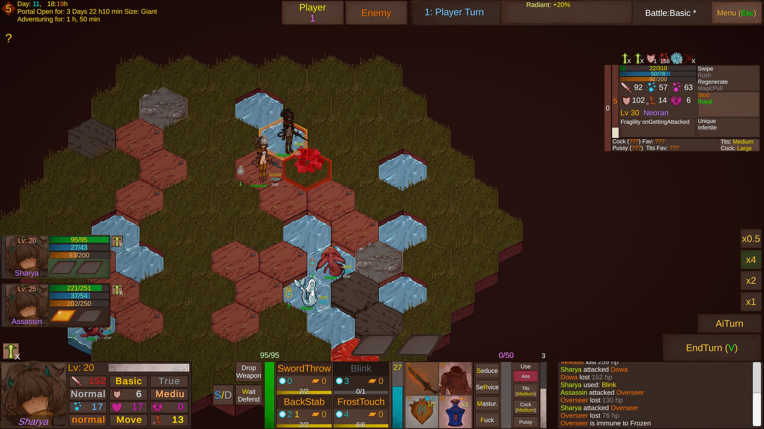 В новой версии Порталов на 1 уровне челленджа (чтобы без духоты вспомнить управление, и заценить новую систему статов с экипировки) смог имбовую уникальную Ассасинку-Суккубку вот до такого разогнать, она фактически одна зарешала за первый раунд суперсекретную босс-ку и ее кошмарного питомца (с ее-то пятью атаками за ход трудно не зарешать), ну и остальные только треш почистили. Кстати лишь после прохождения заметил, что эту ассасинку зовут так же, как зверо-тавриху с рождественской тематикой, за которую проходил этот забег. Попробовать что ли за эту ассасинку полностью соло-ран на суперсекретную босс-ку сделать...