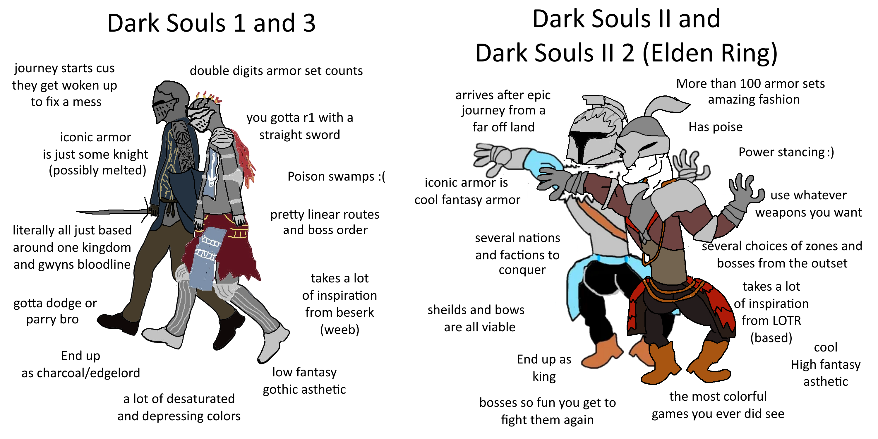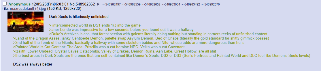 >>50522652 >Но это же логично, что Гвин должен быть ебакой каких поискать >>50522652 >Как-то не верится в такого бога, что он драконов опиздюлил, страну держал ВНИМАНИЕ СПОЙЛЕР АЛЕРТ КТО НЕ ПРОХОДИЛ ДС1 НЕ ЧИТАЙТЕ ЧТОБЫ НЕ ИСПОРТИТЬ ВПЕЧАТЛЕНИЕ то что ты описываешь было очень давно плюс он раздал силы и стал полым. >До сих пор их нет ни в одной игре фромов. Тебе стоит попробовать самую лучшую часть серии дарк соулс - элден ринг, а также длс к ней. >Хватило бы одного города В игре ты ходишь только по определенным участкам городов и подразумевается и видно по задникам что локации намного больше. В Анор Лондо мы идём только по верхушке, с храма огня видны другие стены и много домиков внизу и тд. >Да поболе будет Оттого что там большие высокие стены и несколько больших огромных зданий количество домов внутри не увеличивается. А несколько домов это как раз размер деревни. Короче гугли ИГРОВЫЕ УСЛОВНОСТИ