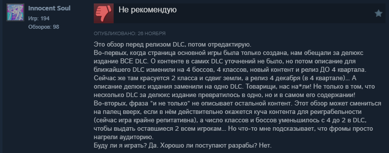 >>50527207 Ващет обещали сразу. Говорили будет точно полгода обнов контентных, потом длс, потом ещё пара месяцев обнов длс и закрываем лавочку. Ещё до релиза заявлялось.