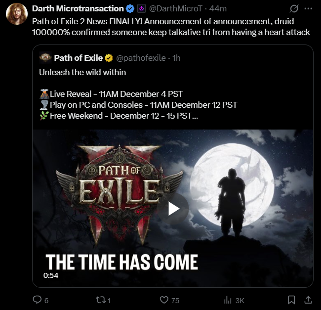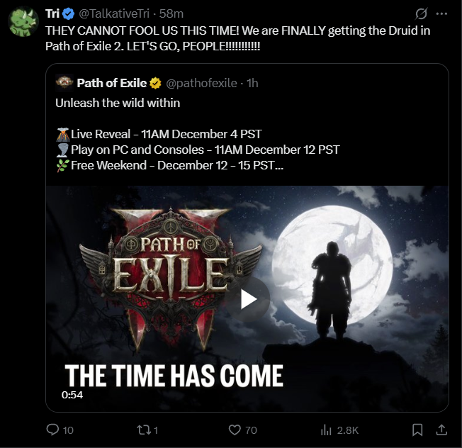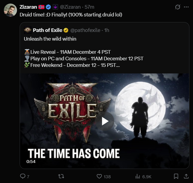 > Here's a list of what we can expect for: > - Druid > - New Weapon (druid themed) > - New Skills > - New Nodes on Passive Skill Tree > - Endgame Improvements > - New Mechanic (League or Core)
