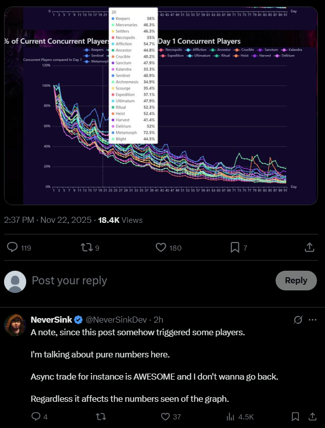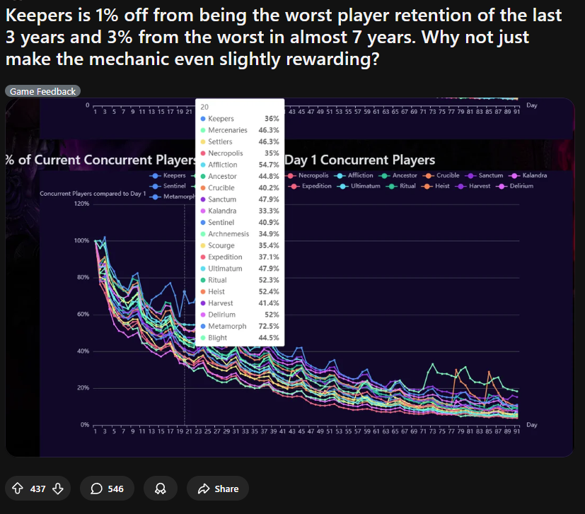это все дерево виновато в слишком быстром прогрессе этой лиге с дерева сыпется сильный гир например 1000 ЕС регалии по 5с люди почти не крафтя оделись и сделали челенжи и ливнули игру большинство казуалов не заинтересованы в эндгейм гринде ради гринда