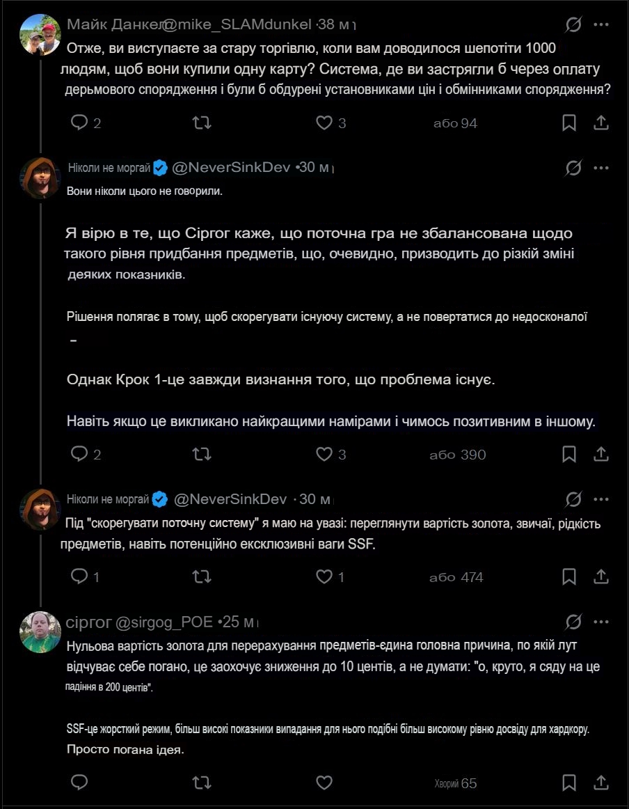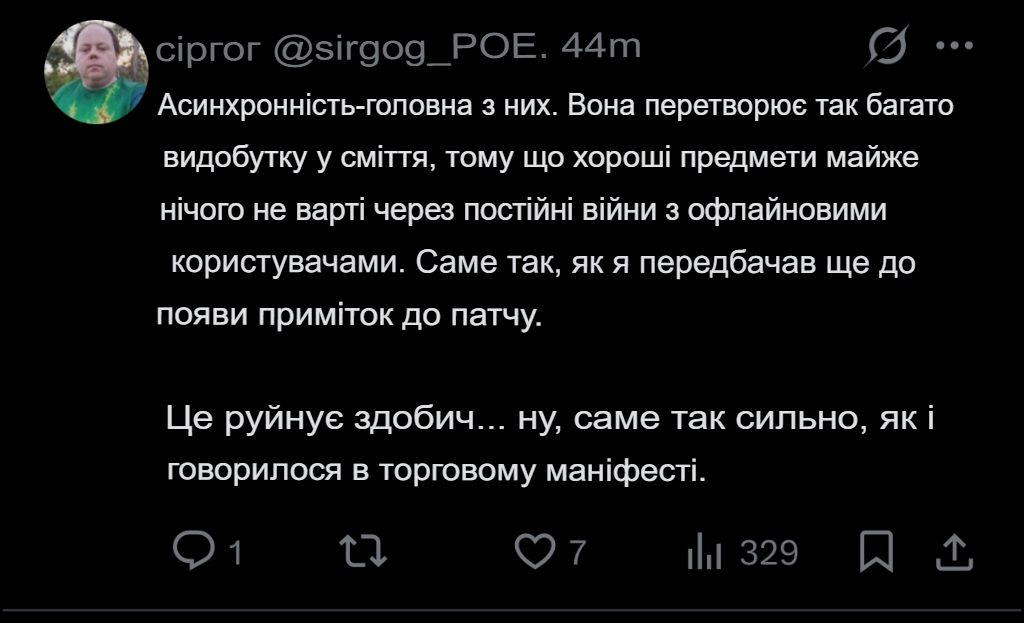 >>50468125 не знаю, мне нихуя не падало. основная проблема пое это торговля, торговля у поешеров это способ заработка, а я считаю что торговля должна быть опцией, способом обмена, а не основной. то есть чтобы игроки были более самостоятельными в способах добычи лута, а торговля была чтоб чисто для обмена. ты можешь сказать, ты и щас можешь обмениваться, а я тебе скажу что даже не смотрю на вещи а сразу всё по 1с выставляю и даже тогда никто ничё не покупает. то есть я и обменять не могу и заработать на этом.