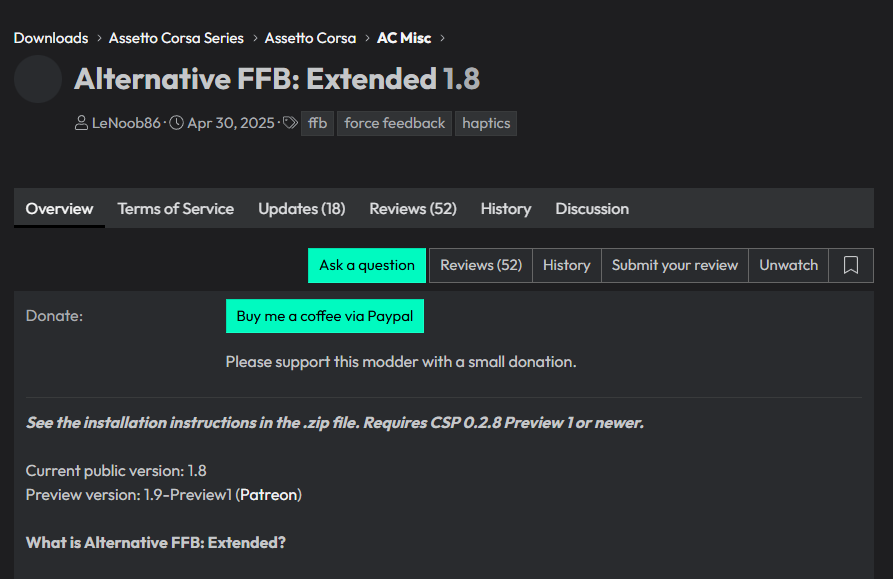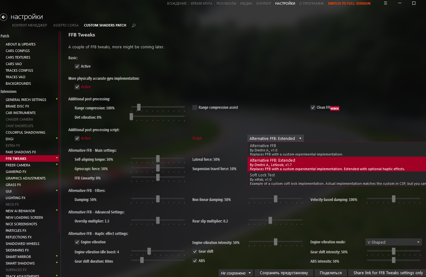 >>50615501 Существенно расширяет спектр фидбека. Ванильный фидбек корсы он вообще пустой. Нет ощущения "зацепа" и "скольжения" передней оси. Крайне слабые вибраций по езде по неровной трассе. Нет вибрации от холостого хода двигателя. Накатил это чудо - и стало существенно больше информации приходить в рулевую колонку. Но я не сравнивал с вариантом который по умолчанию в CSP идёт, сравнивал только с ванилой. В CSP тоже есть какая-то доп.обработка. Может по сравнению с дефолтной CSP отличий у alternative ffb 1.8 почти не будет.