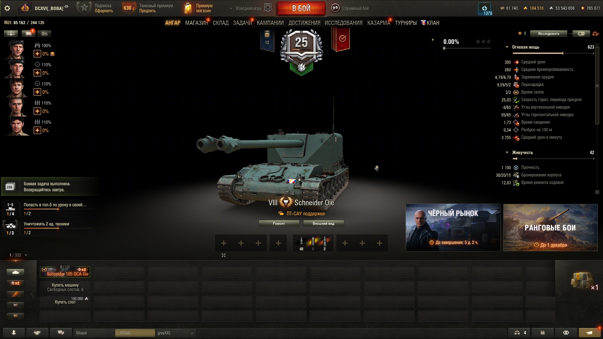 >>50470598 >>50469781 А мне танчик очень понравился. В первом же бою сделал 6 фрагов и 4000+ урона, правда с ботами на полигоне, но тем не менее. Потенциал у танка явно есть! Ни чуть не жалею потраченных на него ресурсов. Лучше я 700к потрачу на прем 8ку, на которой буду играть, чем на 10ку (в конструкторском бюро), которая будет пылиться в ангаре (у меня таких несколько, на которых я ни одного боя не скатал)